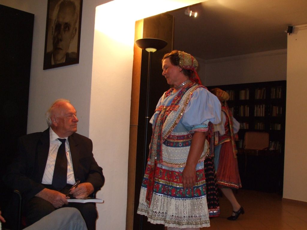 Ág Tibor a Pozsonyi Kaszinóban Bartók Béla képe alatt ülve a martosi hagyományőrző éneklőcsoport vezetőjével, Keszeg Máriával