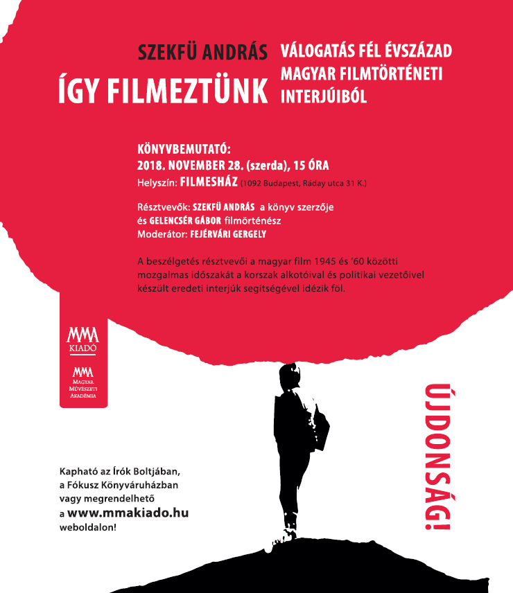 A Magyar Művészeti Akadémia Kiadója bemutatta Szekfü András Így filmeztünk című könyvét, amely fél évszázad hazai filmtörténeti interjúiból közöl válogatást. A könyv a magyar film 1945 és '60 közötti mozgalmas időszakát a korszak alkotóival és politikai vezetőivel készült eredeti interjúk segítségével idézi fel. A könyvbemutatón, a Filmesházban Gelencsér Gábor filmtörténész, Szekfü András filmtörténész, a könyv szerzője, Rózsa János filmrendező és Fejérvári Gergely, az MMA Kiadó szerkesztője beszélgettek.
