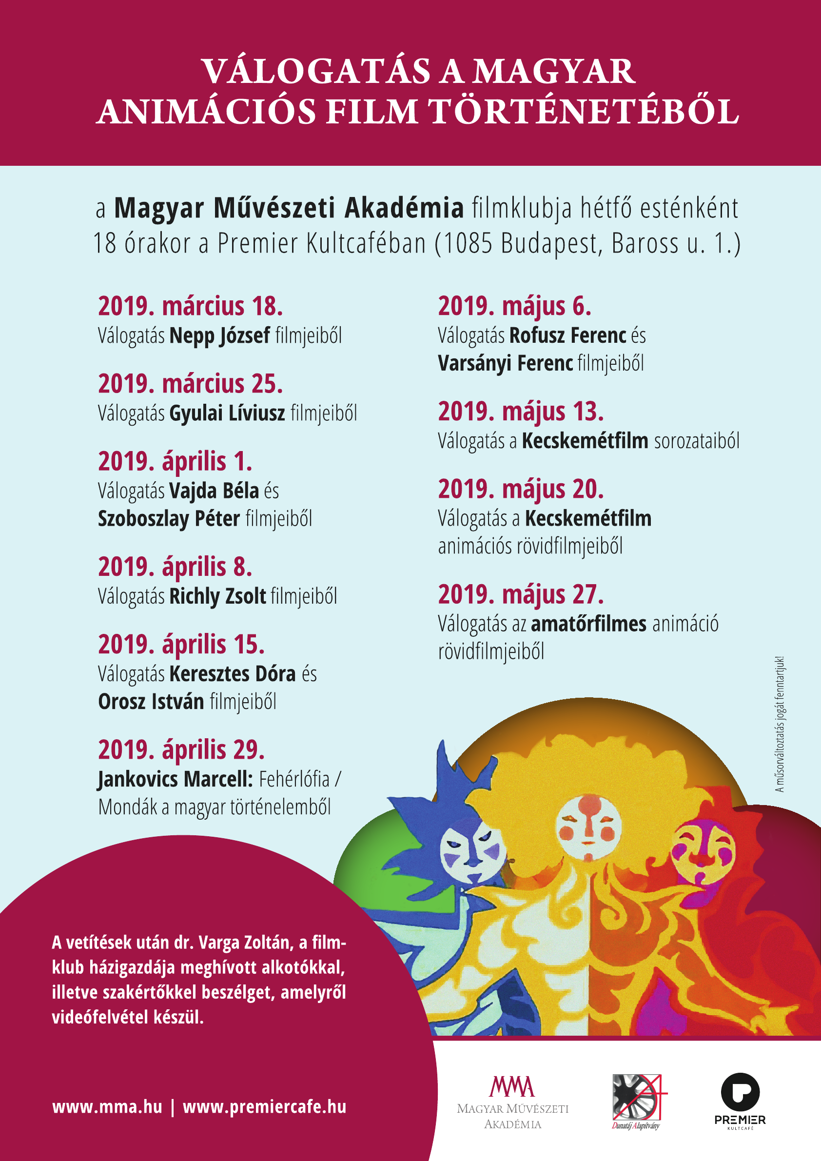 A Magyar Művészeti Akadémia Film- és Fotóművészeti Tagozatának filmklubja, Válogatás a magyar animációs film történetéből címmel a tavaly őszi 10 és az idei 15 estén át bőséges betekintést nyújt, a teljesség igénye nélkül, a hazai animáció kincsestárába. A március 18-án a második blokkal folytatódó sorozat (vetítések hétfő esténként, 18 órakor a Premier Kultcafé moziteremben) filmösszeállításából könnyen érthetővé válik, miért mondható olyan színesnek, sokfélének a magyar animáció. Láthatunk példákat a fekete humor és az ornamentális stílus mesterműveire, s feltárul a vidéki műhelyek – a Kecskemétfilm és a pécsi stúdió – filmtermésének gazdagsága is. Összeállításunk a magyar amatőrfilmek mellett a kortárs animáció jelenségeit is felöleli, az új alkotói nemzedék nagy sikert arató munkáitól kezdve a számítógépes animáció hazai eredményeiig. A tavaszi 10 alkalmat ősszel további 5 hétfő esti vetítés követi.