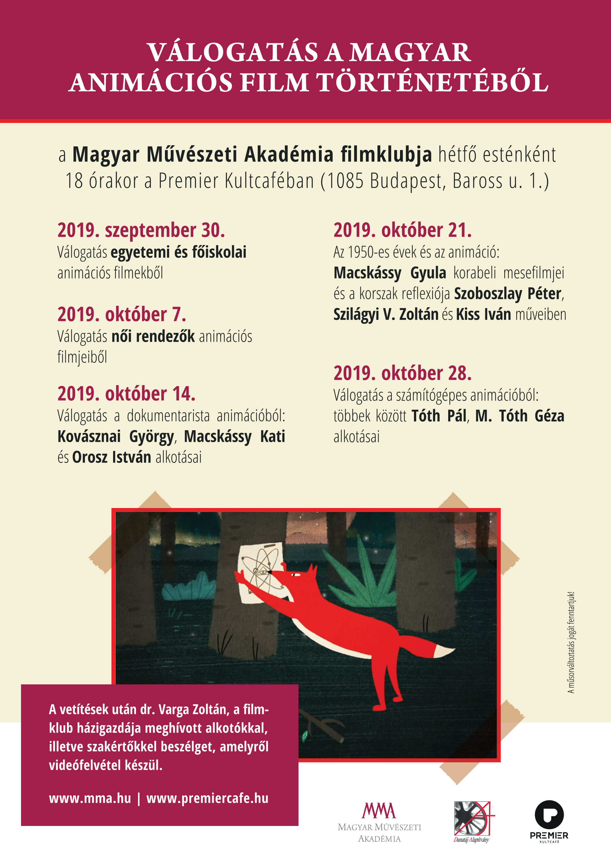 2019. szeptember 30-tól folytatódik a Magyar Művészeti Akadémia tavalyi évben elkezdett vetítéssorozata, amely a hazai animáció több mint egy évszázados történetéből ad átfogó válogatást. Az animációs filmklub befejező, öt alkalmas (október 28-áig tartó) etapjában a ma már alig vagy egyáltalán nem látható alkotások mellett az utóbbi évek nemzetközi sikereket elért animációi is helyet kapnak. A hétfő esti vetítések helyszíne ezúttal is a Premier Kultcafé (volt Vörösmarty mozi).