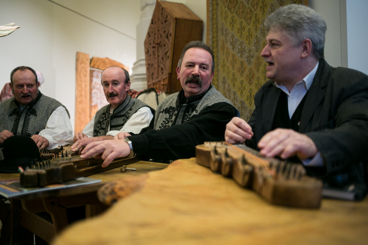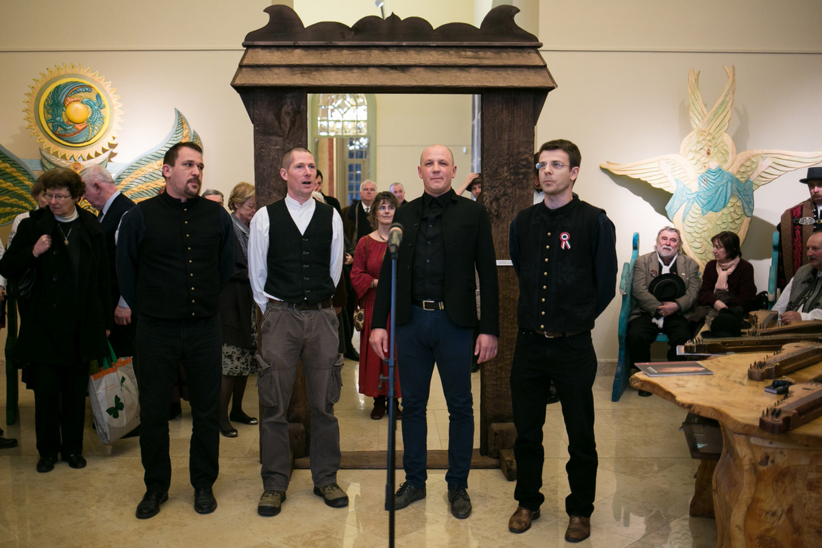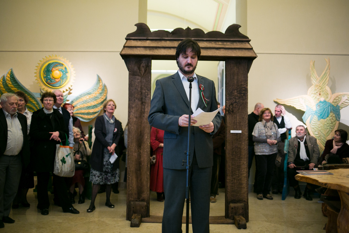 | A kiállítást március 14-én dr. Kucsera Tamás Gergely nyitotta meg. A Magyar Művészeti Akadémia főtitkára méltató beszédében kiemelte, hogy Galánfi András természetes és ősi alapanyaggal dolgozik, s a fában sokszor egyszerre jeleníti meg az archaikust és a jelenbelit. Ugyanakkor munkáiról az is elmondható, hogy amit alkot az kézreálló, praktikus és kényelmes. „András Bátyám az embernek alkot: asztalt, széket, bölcsőt, különböző tájegységek népművészeti örökségét mutató módon, vagy éppen az ősi-modern tisztasággal – mondta. – A Nagy Kristóffal elkészített első hazai fa játszótér, a közösségi terek teret, s lelket formáló alkotásai: a szoboszlói padok, a pányoki ház tornáca, a fehérgyarmati lélekharang, a kálmánházi harangláb, vagy a Matl Péterrel közösen alkotott hajdúsámsoni közösségi ház turáni ornamentikát mutató faragása is ezt mutatja, akárcsak az előadóművészi múlt, az egész életen át vállalt-vitt tanári hivatás is. A tudomány világában az akadémikussá válás egyik kritériuma az iskolateremtő képesség megléte, Galánfi András ebben az értelemben is akadémikus, elég csak – más hasonló tevékenysége mellett – a nádudvari népi kézműves iskolára és táborokra gondolnunk. Élete során mindig közösségi ember volt, így alapítója a Fiatalok Népművészeti Stúdiójának, részese a nomád nemzedék mozgalomnak, számos tábor és alkotóház lelke" – mutatott rá dr. Kucsera Tamás Gergely. A tárlat megnyitóján közreműködött a Nádudvari Kézműves Szakiskola néhány növendéke, illetve a Bárándi Citerazenekar. |