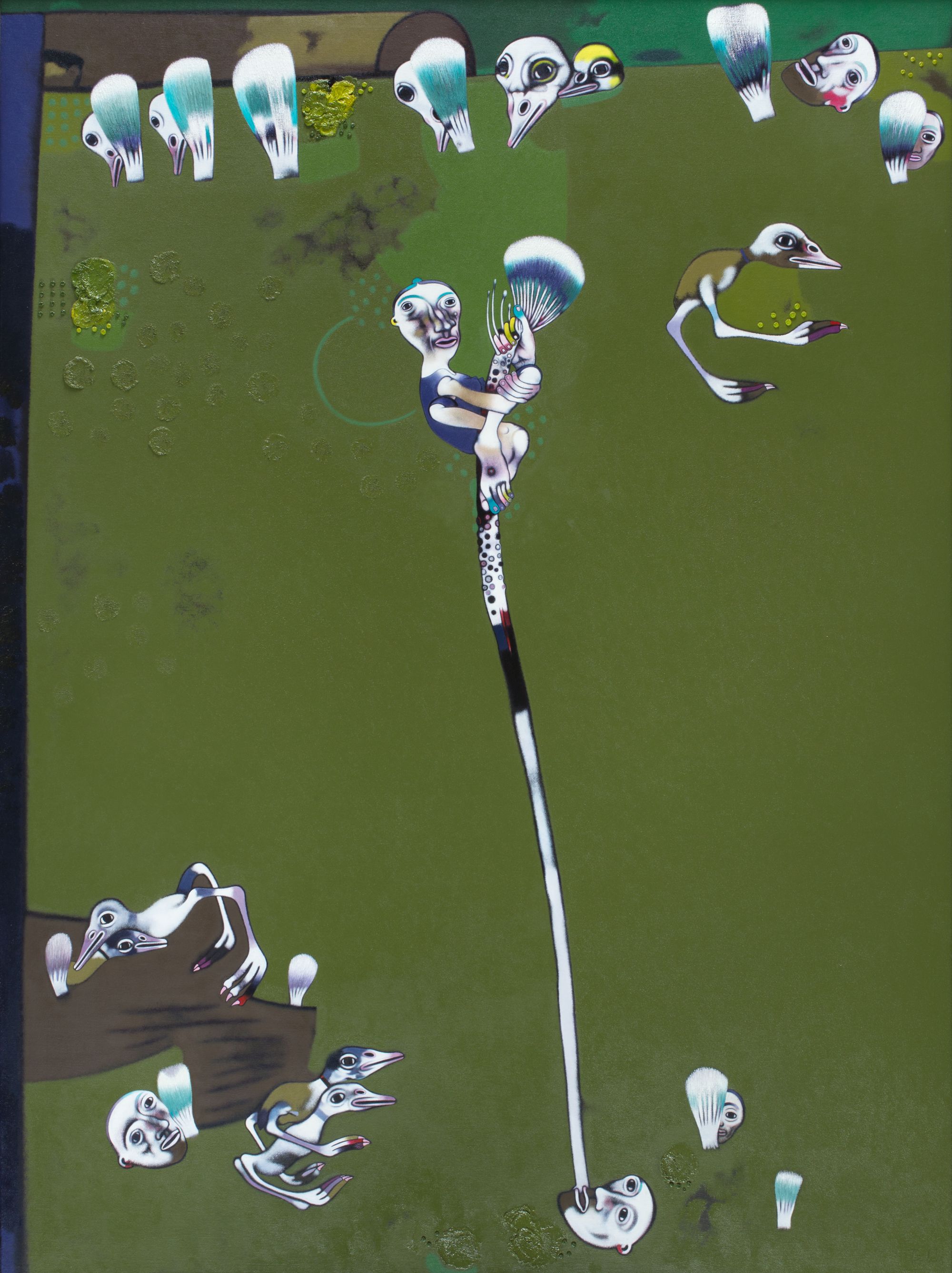 A festett munkáin gyakori képszervező körforma a szobrokon is domináns. Kitüntetett példái ennek a közbülső terem két bejáratába állított Röptetőfa I–II. című alkotások, amelyeken a madárfiókák görcsösen kapaszkodnak, mintha moccanni sem akarnának – holott létezésük, az életbe lépésük és maradásuk a tét. A tárlatlátogató is arra van késztetve, hogy karikavázukon át lépjen be a térbe.