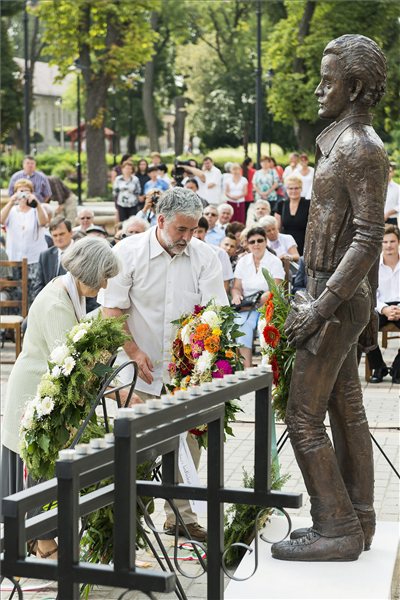 Ratkó Józsefné, a költő özvegye és fia, Ratkó József koszorút helyez el a szobornál. MTI Fotó: Balázs Attila
