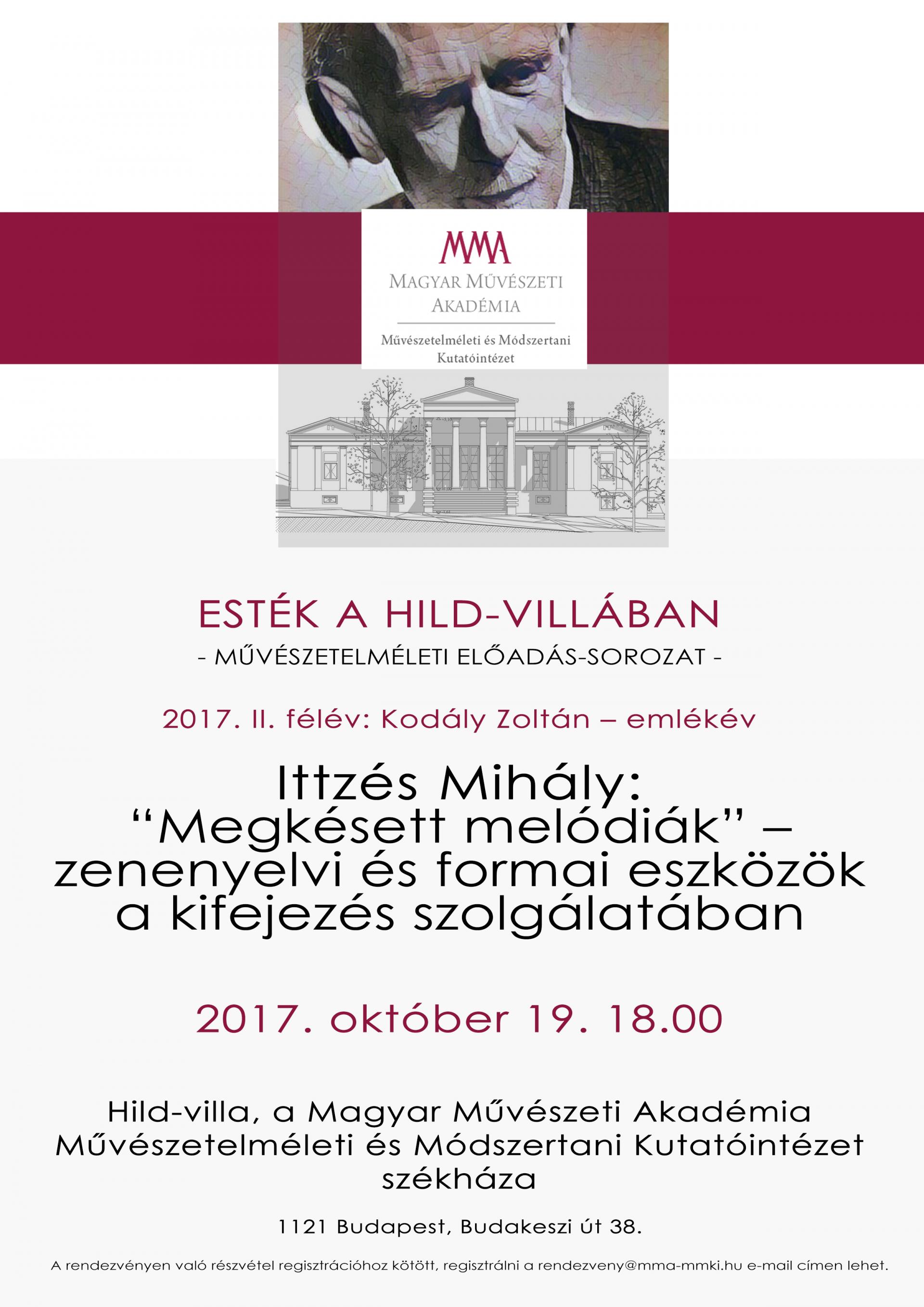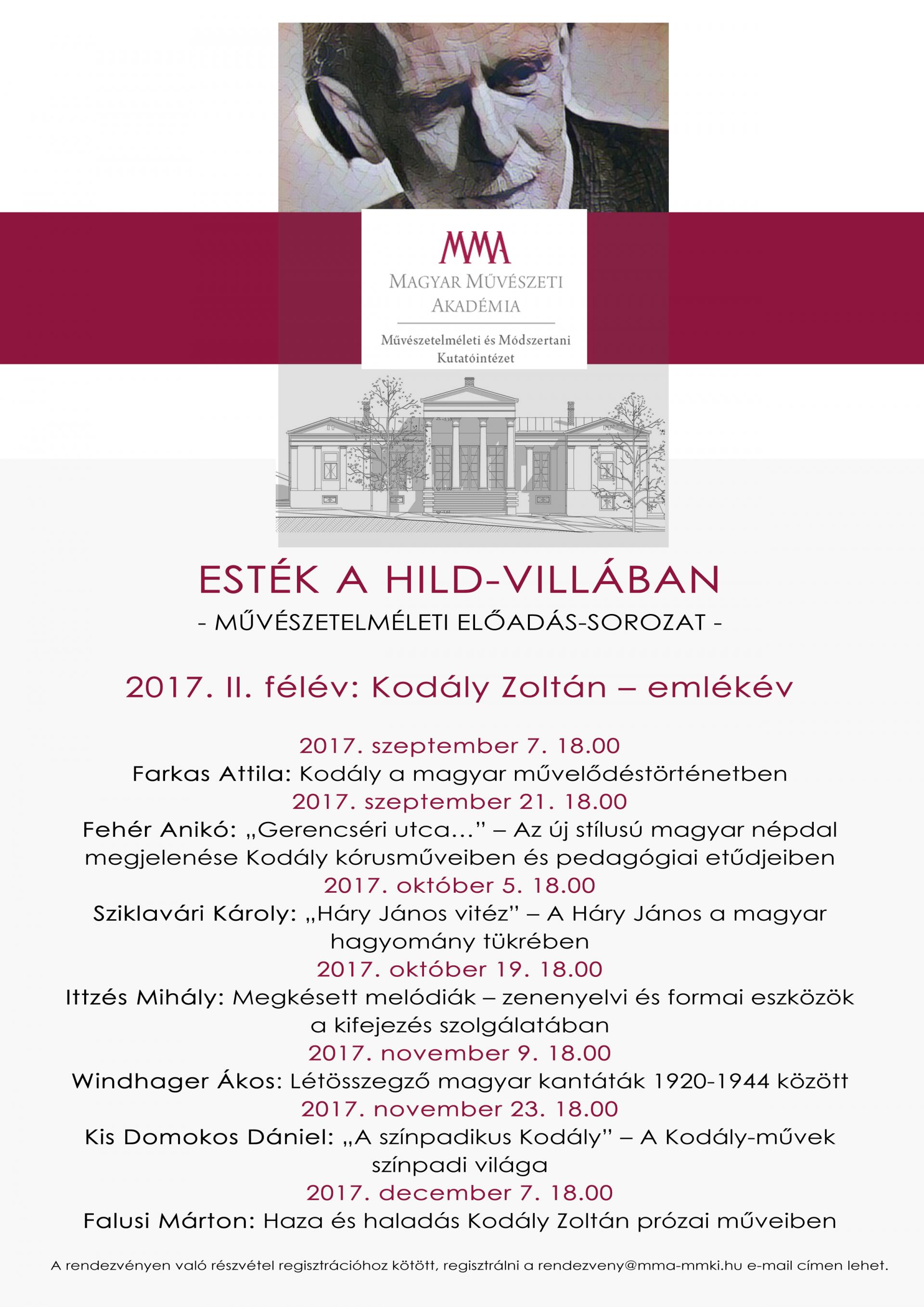 2017 őszén folytatódik a Magyar Művészeti Akadémia Művészetelméleti és Módszertani Kutatóintézetének Esték a Hild-villában elnevezésű rendezvénysorozata, ahol a kéthetente csütörtökönként megtartott művészetelméleti előadás-sorozat aktuális témája a Kodály Zoltán munkássága, zenepedagógiai, művészeti hatása – az emlékévhez kapcsolódva. A következő alkalmon, október 19-én Ittzés Mihály zenepedagógus, az MMA rendes tagja előadását hallgathatják meg az érdeklődők.