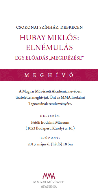 A Csokonai Színház 2010-ben az immár klasszikusnak nevezhető kortárs írónk, Hubay Miklós előtt a pályája utolsó szakaszában született Elnémulás című dráma stúdiószínházi megvalósításával tisztelgett.