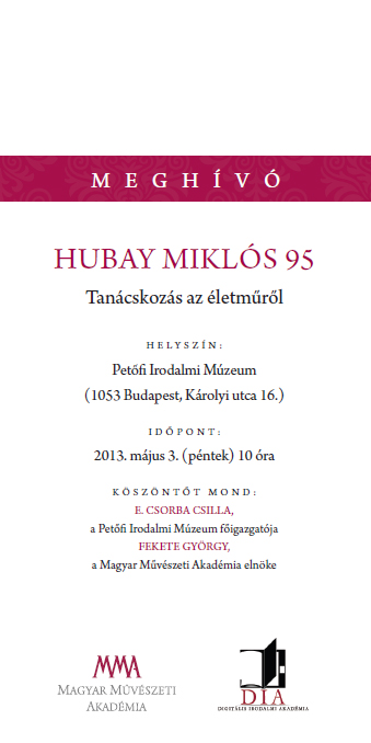 A Magyar Művészeti Akadémia 2013. május 3-án Hubay Miklós Kossuth-díjas drámaíró és műfordító 95. születésnapja tiszteletére Tanácskozás az életműről címmel konferenciát rendez a Petőfi Irodalmi Múzeumban.