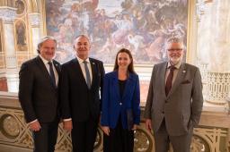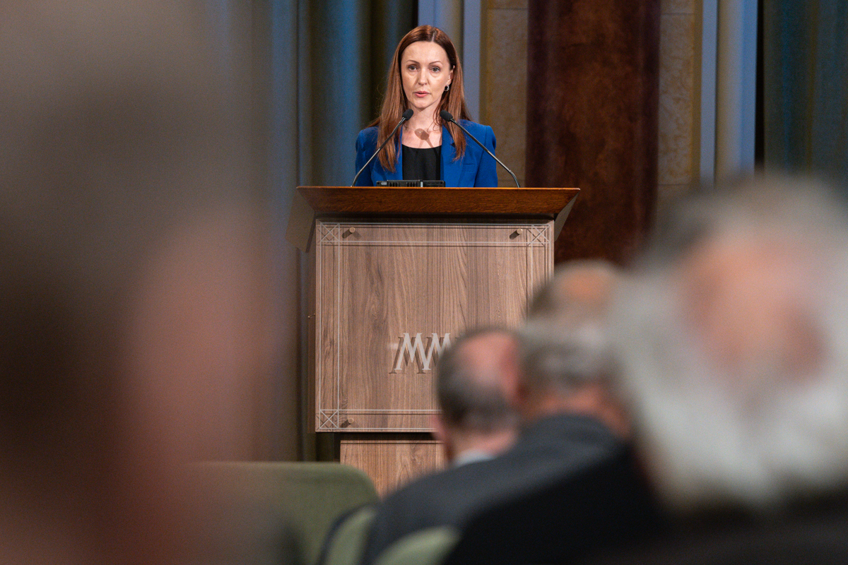 Korunk lényege a művészetben sűrűsödik össze – jelentette ki államtitkár asszony Gyarmathy Tihamért, az MMA egyik alapító tagját idézve. A művészeti akadémiai szféra feladata a kultúra elmélyítése – hangsúlyozta -, amelyhez a műalkotások megsokszorozásában, a múlt értékeinek megismertetésében az oktatás, az alkotáshoz szükséges feltételek megteremtésében pedig a kultúrpolitika lehet a segítsége. Örömét fejezte ki, amiért a minisztériumnak olyan szakmai partnere van a kultúráért végzett tevékenységében, mint az MMA, amely támogatja és szakmai partnerséget nyújt a magyar kulturális intézetek nemzetközi tevékenységének is. A mai kulturális vezetőknek, intézményeknek és köztestületeknek példa lehet a 150 éve született Klebelsberg Kunó életműve, az ő szellemiségét folytatva kell a magyar kultúra emelkedéséért és méltó nemzetközi képviseletéért tevékenykedni.