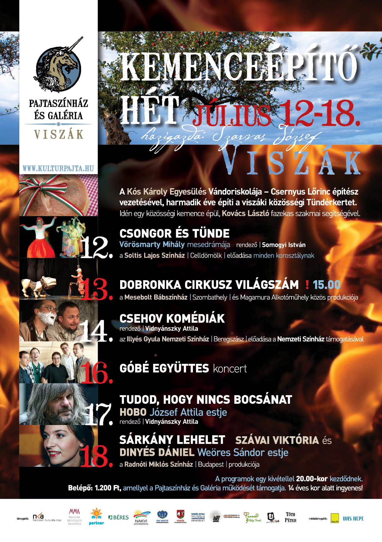 | "2009-ben életre hívtuk a Kárpát-medence végtelen fajtagazdagságú gyümölcshagyatékát mentő, viszáki Tündérkertet, aminek ma már közel száz közösségi kert követője van szerte a medencében. De mitől közösségi egy kert ? Kónyán éltem gyermekkorom első tíz évét. Meghatározó, pozitív élményem fűződik a hétvégi kemencés napokhoz, mikor minden hétvégén más háznál gyúrtak közös élménnyel tésztát az asszonyok, s azt vasárnap reggel megsütötték a közösség kemencéjében, s vitte mindenki büszkén haza, saját családi asztalára. Szóval egy kert is attól közösségi, ha benne emberek, összeműködő tevékenységet folytatnak. Jó szándék és jóakarat vezérelte, közösségerősítő szándékú kemencét épít július 12–18. között Viszákon, a Makovecz Imre által létre hívott Kós Károly Egyesülés, vándor-iskola, Viszák közösségének épülésére. A viszáki Pajtaszínház és Galéria az új értéket létrehozó, kultúraközvetítő építőknek ajánlja programját." (Szarvas József) |