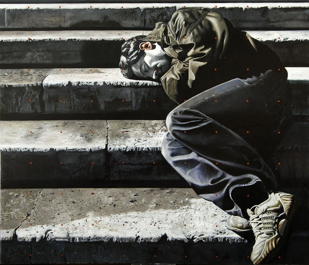 A fekvő figurák pedig – akik amúgy csak ritkán hajléktalanok – én inkább elesettekként választom ki a modelleket – a kiszolgáltatottság esztétikájának részei – ahogyan egy méltató barátom nevezte őket. Nem a sajnálat avagy az együttérzés kiváltása a szándékom, ellenkezőleg. Inkább a fekvő férfiak és nők – az ember – időtlen szépsége az elsődleges. Hiszen nincs semmi csodálatosabb az embernél, ezt már az ókori görög filozófia is fennen hirdette.