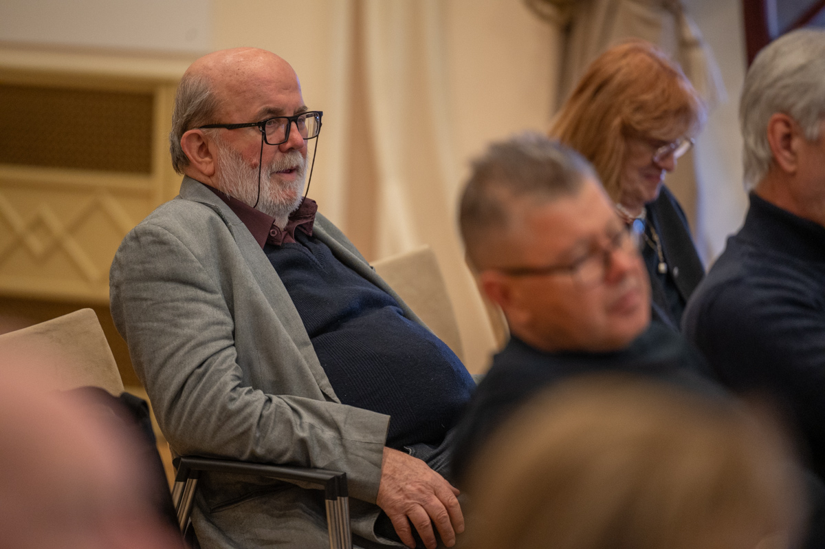 Elek Tibor a sors- és létproblémát mélységében érintő Szavak a magasban című miniesszéjét olvasta fel. „A művészet képes összekötni az eget és a földet, képes a való élet zűrzavarából az élet szentségét kimenekíteni – olvasom a Magyar Művészeti Akadémia állásfoglalásában. De miért is kell összekötni, amikor a körülbelül ötezer évvel ezelőttről származó, Hermész Triszmegisztosznak tulajdonított szöveg szerint az, ami lent van, ugyanaz, ami fent van, és ami fent van, ugyanaz, ami lent van."
