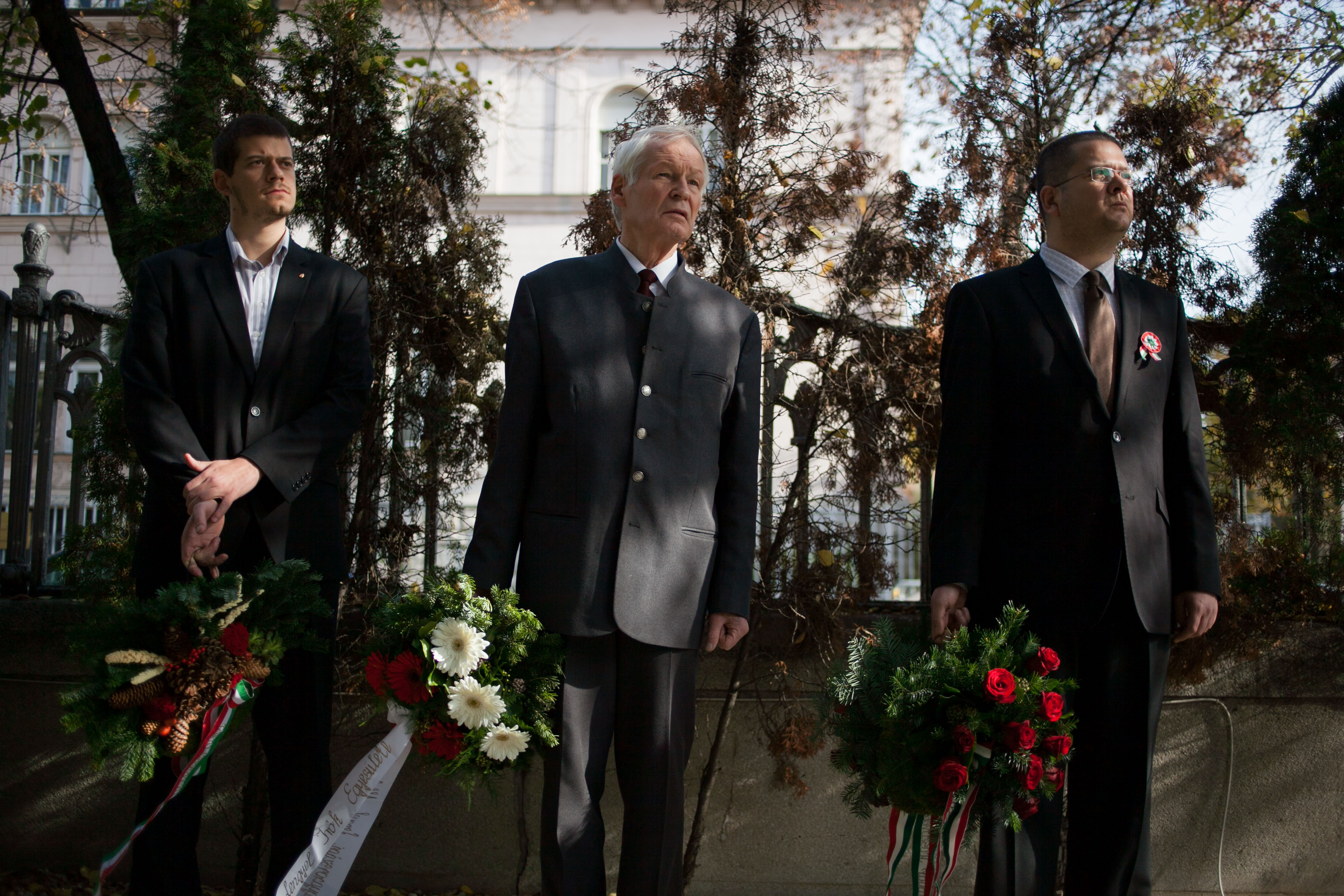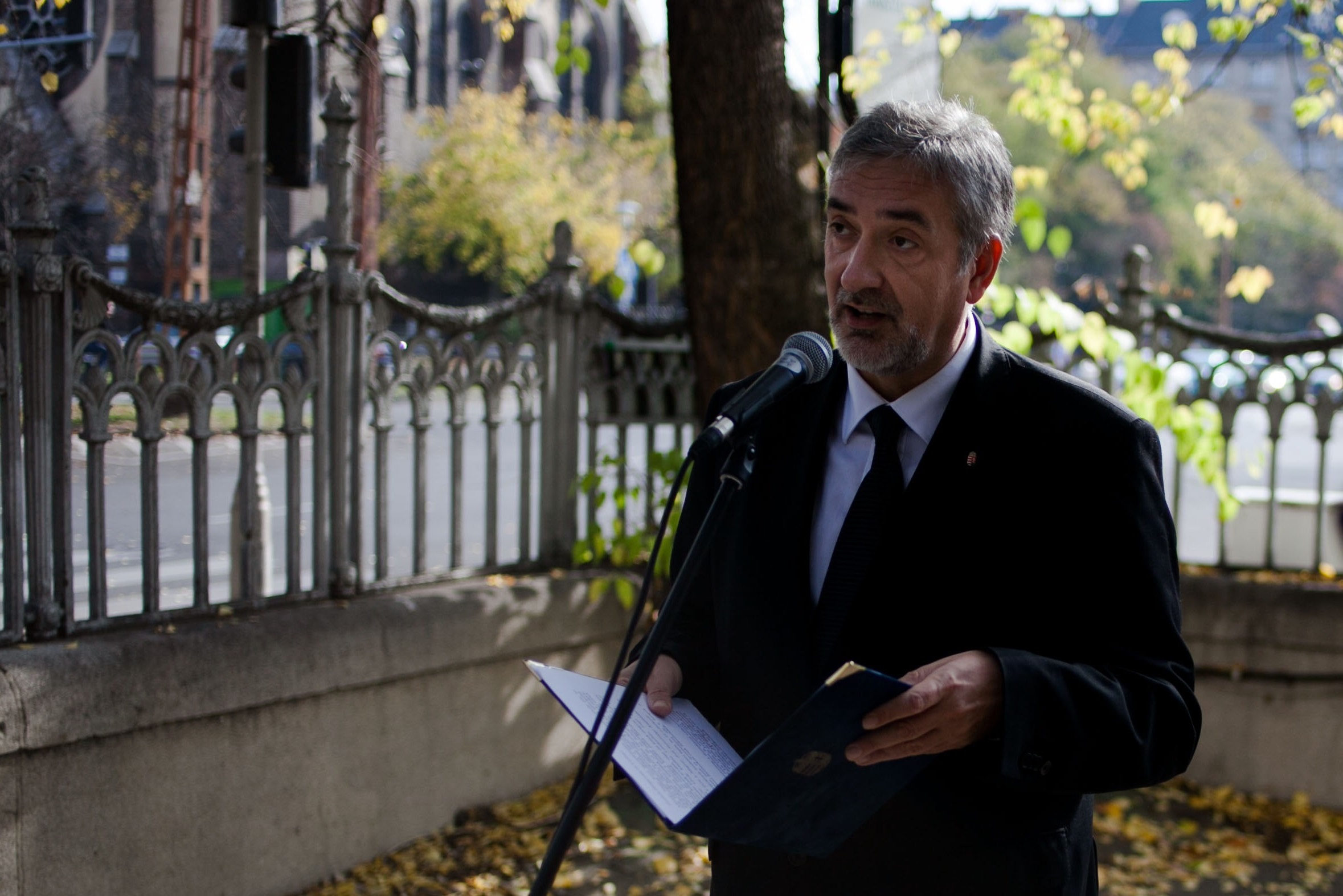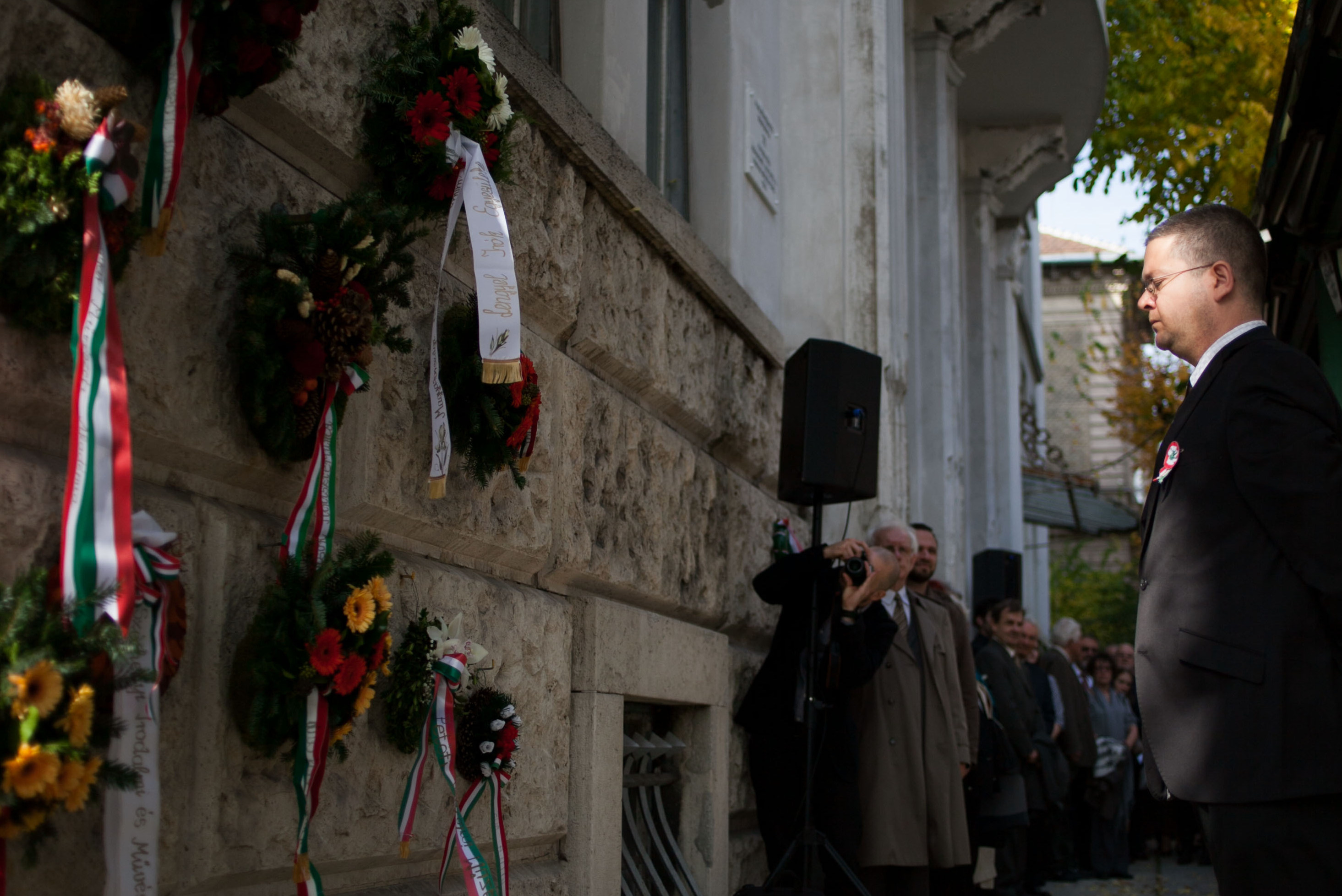 A megemlékezésen köszöntőt mondott Halász János, kultúráért felelős államtitkár, aki beszédében az 56-os események részleteiről, az írók megkerülhetetlen szerepéről, az emlékezés és a tettek fontosságáról, valamint Gérecz Attiláról szólt. Ezt követően Kiss Dénes Sugárzó októberünk című versét Szersény Gyula tolmácsolta az összegyűlteknek.  Koszorút helyezett el az az 56-os emléktáblánál Szentmártoni János, a Magyar Írószövetség elnöke; Halász János az Emberi Erőforrások Minisztériuma képviseletében; Ács Margit, a Magyar Művészeti Akadémia elnökségi tagja; Erős Kinga, a Széchenyi Irodalmi és Művészeti Akadémia részéről, Temesi Ferenc, a Magyar PEN Club alelnöke, E. Csorba Csilla, a Petőfi Irodalmi Múzeum igazgatója, valamint Mezey Katalin, a Magyar Írók Szakszervezetének képviselője.