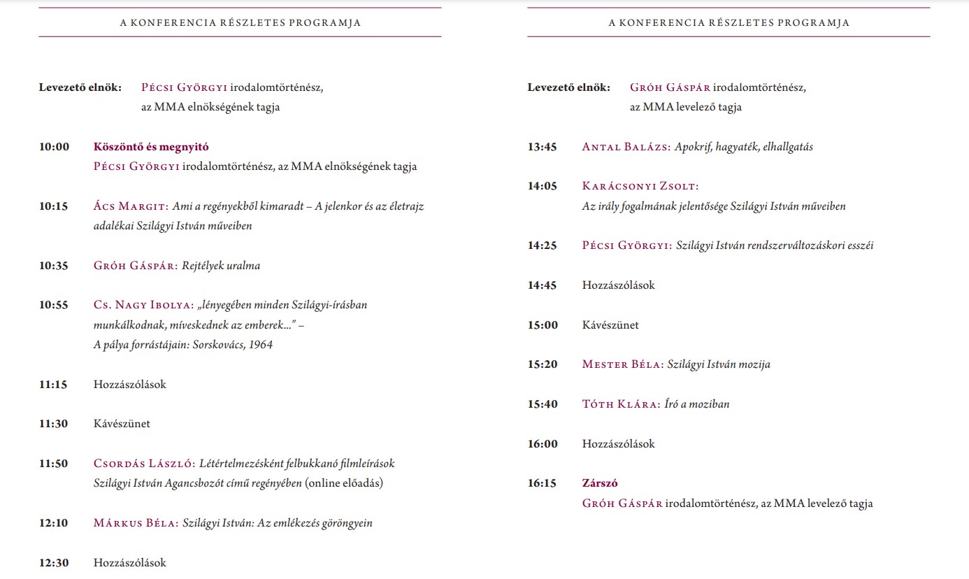 Szilágyi István még életében klasszikussá vált korszakos, Kő hull apadó kútba című regényével és a Hollóidővel. Köteteinek száma az elmúlt években megduplázódott, új műfajok is előtérbe kerültek, s mára kiderült, a korábban ismeretlen Szilágyi-írások sem maradnak el a nagyregényektől – vette számba az életművet köszöntőjében Pécsi Györgyi irodalomtörténész, a konferencia társszervezője. Az MMA Kiadó gondozásában 2019-ben megjelent prózaválogatás, a Katlanváros írásai külön-külön fellelhetők a kolozsvári Utunk évkönyveiben, a családtörténetek együttes kiadása mégis meglepetésként hatott: a szemérmességen átütő személyesség kevéssé ismert arcát mutatja meg az írónak. A Szilágyi István-életműsorozatban 2020-ban jelent meg a várva várt új regény, a Messze túl a láthatáron, majd 2021-ben A hóhér könnyei, amely válogatást ad az író publicisztikai munkásságából.
