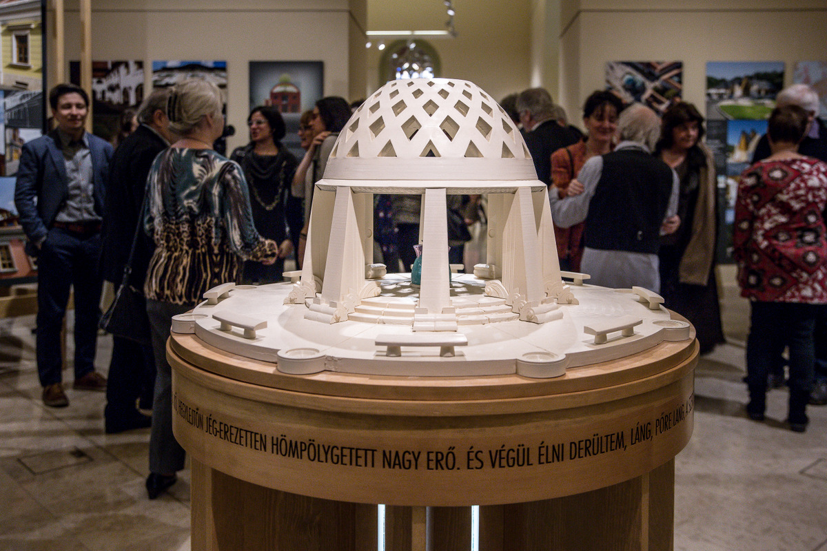 – Az életmű-kiállítás nehéz műfaj. Az embernek a saját múltjában kell vájkálnia, és néha olyan dolgokkal is találkozik, amire nem számít. De mivel ötven éve vagyok a szakmában – ha az egyetemi éveket is beleszámítom – úgy éreztem, hogy a kiállításon még a negyven évvel ezelőtti dolgokat is érdemes bemutatni. Tettem ezt azért, hogy egy fejlődést lehessen a kiállításban érzékeltetni. Ezért is volt nehéz az összeállítás. Egy olyan tematikát találtam ki a kiállítás kurátorával, Dénes Eszterrel közösen, amelyben egy főművet választottunk ki. Ez Budapesten, a Szent Gellért téren álló Forrásháznak az épülete. Azért választottuk ezt, mert bár ez egy pici épület, de világmodell, amelyik a Föld energiáit, és a Föld fölé boruló kozmosz világmindenséget szimbolizálja. Ez az épület ezzel a céllal is született annak idején tizenhat évvel ezelőtt, amikor megépült. Ha az életművemben már szerepel egy ilyen világmindenséget modellező darab, akkor miért ne tegyük ezt a kiállítás központi témájává?