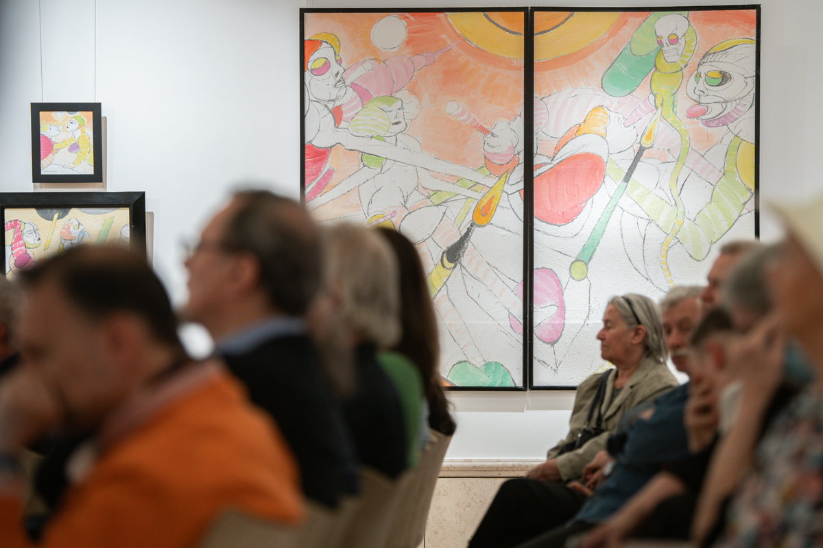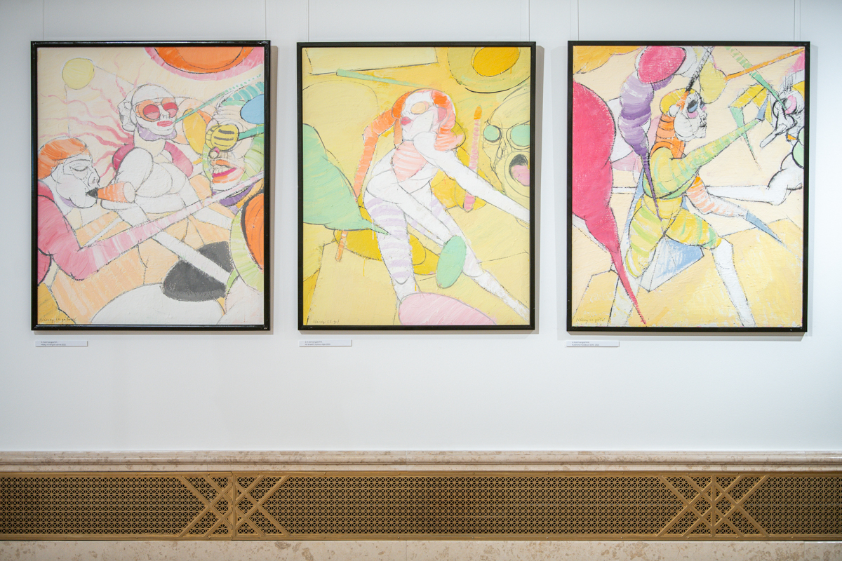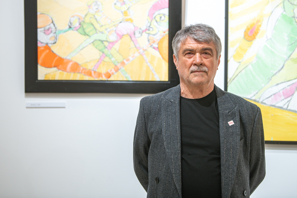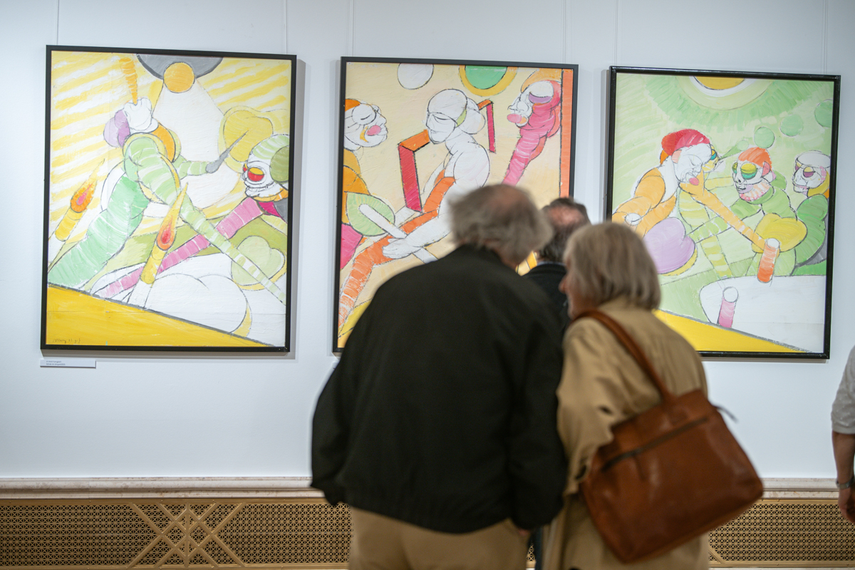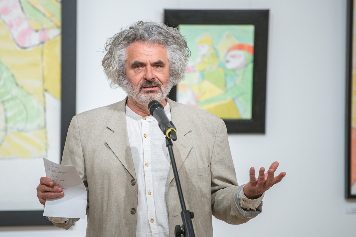 A Pesti Vigadóban, az MMA Székházában, az V. emeleti kiállítóteremben május 9-én nyílt meg a tárlat a művész erőteljes líraiságot sugárzó festményeivel, melyek a figurativitás és az absztrakció, a rajzolt és festett, a gesztus és faktúra együttes használatával szólaltatják meg a művész sokszor humoros, ironikus, drámaisággal telített festői világát.