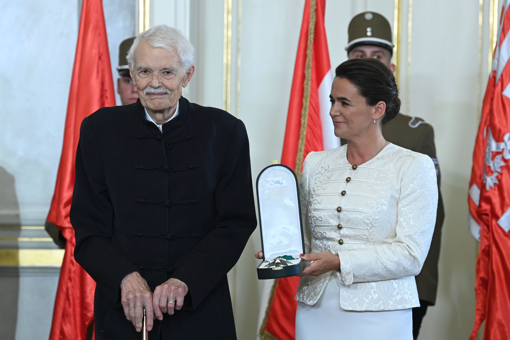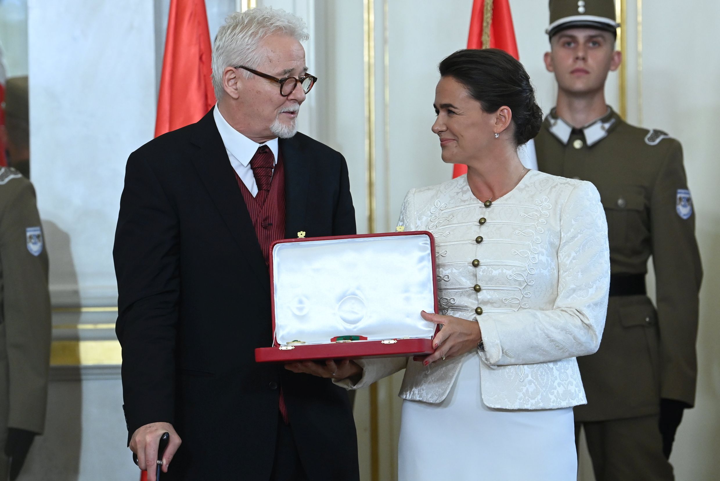 Rofusz Ferenc, a Nemzet Művésze címmel kitüntetett, Kossuth-díjas rajzfilmrendező átveszi a legmagasabb állami kitüntetést, a Magyar Szent István-rendet Novák Katalin köztársasági elnöktől a nemzeti ünnepen a Sándor-palotában 2022. augusztus 20-án [fotó: MTI/Máthé Zoltán]
