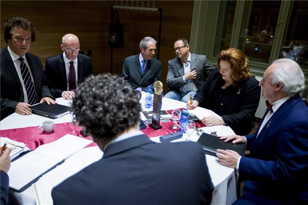 Marton Éva Kossuth-díjas operaénekes és a zsűri tagjai: Peter Mario Katona, Pål C. Moe, Miguel Lerín és Vittorio Terranova, valamint Szabó Stein Imre, a Zeneakadémia kommunikációs igazgatója (MTI Fotó: Zeneakadémia / Tuba Zoltán)