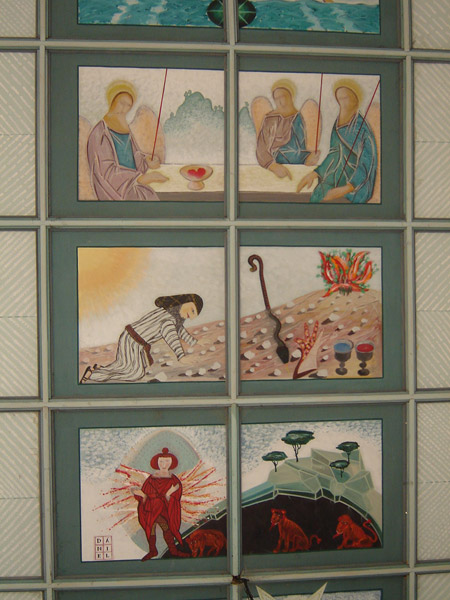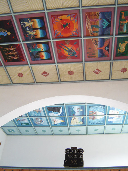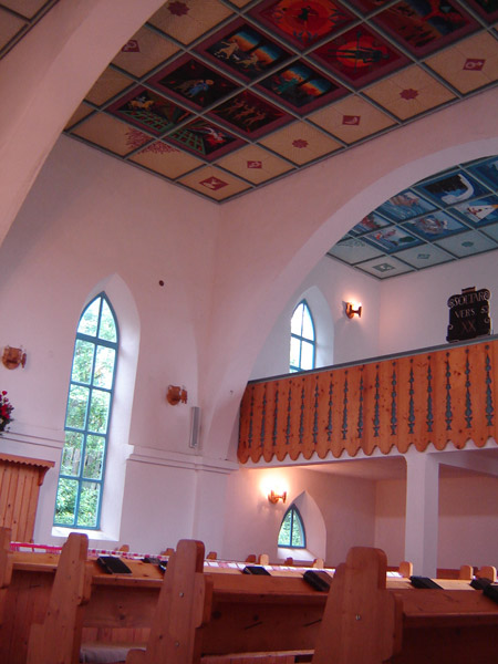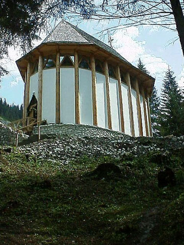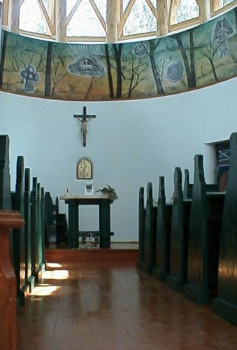 Az Anthony Gall tervezte kápolna külső és belső szellemiségének értelmezése A kápolna „határhelyzet": a Kárpátokon átmenő út utolsó, illetve első állomása, erődpont, amely értelmezhető földrajzi és geológiai határpontként is, valamint kultúrák, vallások törésvonal-menti pontjaként egyaránt. Az alaprajz ellipszisének hossztengelye megfelel az ún. keletelt templomok helyzetének, (bejárat: Nyugat, oltár: Kelet) meghatározó jelentőséget tulajdonítva ezáltal az ősvallások legfőbb szimbólumának, a Napnak, a Tűznek. Felfogható a kápolna tengelye egy olyan jelképes fa törzseként is, amelynek északi ágain a sztyeppei kultúra és a bizánci vallás jelképei élnek, míg a déli ágakat az európai, nyugati kereszténység jelképrendszere ékesíti. A templomot impozáns természeti látvány, sziklák tömegei és fenyőfélék oszloperdeje övezi, s mindez szinte folytatódik az épület szerkezetében. A domb alatt zúgó Békás patak a másik ős-elemünket, a vizet képviseli állandóan morajló hangjával. Mindez olyan panteista gondolatokat ébreszt, amelyek indokolják a természeti elemek belső térben való megjelenítését egyrészt a falfestészet eszközeivel, másrészt a berendezés megformálásával. Az elképzelés szerint a kápolna már említett északi, homorú falfelülete hordozza a honfoglalás kori hitvilág és a korai kereszténység jelképeit. E rész uralkodó színvilágát a víz tónusai határozzák meg, a rajzos elemeken a szürke és a fekete dominál, míg a déli oldal - amelyen a kereszténység szimbólumai jelennek meg, - különös tekintettel a magyar történetiségből vett ábrázolásokra, egyházi jelképeink és értékeink tárgyi motívumaira - melegebb színeket ölt. (A körkép méretei: 130 cm magas és 24 méter hosszú.) Hasonlóképpen a hagyományra utal az erdélyi fafaragás elemeit idéző szakrális berendezés: az oltárasztal, a pulpitus, a szentségtartó, a keresztelő medence és a térben függő korpusz, a XVIII. századi fafaragás. A mennyezet deszkázata, az eget idéző csillagszerkezet díszes kiosztású, míg a padló a hossztengellyel párhuzamosan fut, erre helyeződnek halszálka elrendeződésben az egyszerű kivitelezésű padok, melyeket a sorok kezdetén faragott, festett járomkonty díszít. Hasonló megoldású a papszék, valamint a ministránsok széke is. A világítást a magasan körbefutó ablaksor természetes fénye, de szükség szerint rejtett elektromos világítótestek is biztosítják. (Forrás:epiteszforum.hu) |