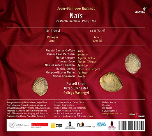 „Rameau „hősi pásztorjátéka", a mindössze öt hét alatt eltervezett és megkomponált „Naïs" az osztrák örökösödési háborút lezáró aacheni békekötés alkalmából született. A sikere 1749-ben olyan nagy volt, hogy a darabot tizenkét héten át folyamatosan játszották. A magyar Vashegyi György régi zenei karmesterként a spanyol hanglemezkiadó, a Glossa számára igazán jó előadógárdát állított össze. Ebben helyet kapott a női főszerepet gyöngyházmód csillogó hangon éneklő Chantal Santon-Jeffery és Reinoud van Mechelen mint a víz és az énekhangja fölött hatalommal bíró Neptunusz, aki végezetül a habok közé veti magát.