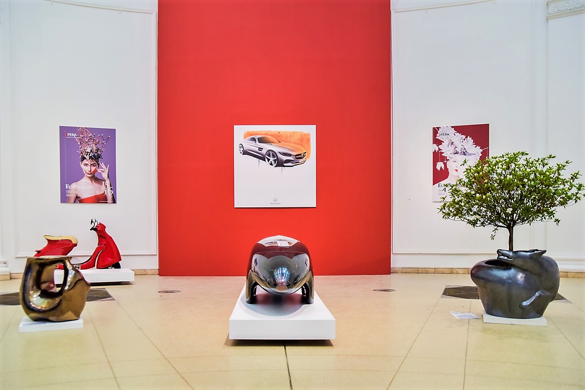 Az apszis a közterek és a közlekedés világát tárja a látogató elé többek között autókon, robogókon, képeken, maketteken és egy vitorlás hajón keresztül, míg az oldalsó termekben a speciális területek, például a könyv- és a bélyegtervezés, az animáció, a film vagy a sport, illetve a szakralitás világa tűnik fel, de az augusztus 13-ig látható tárlat külön termet szentel a letűnt korok tervezőművészete megőrzési lehetőségeinek is.