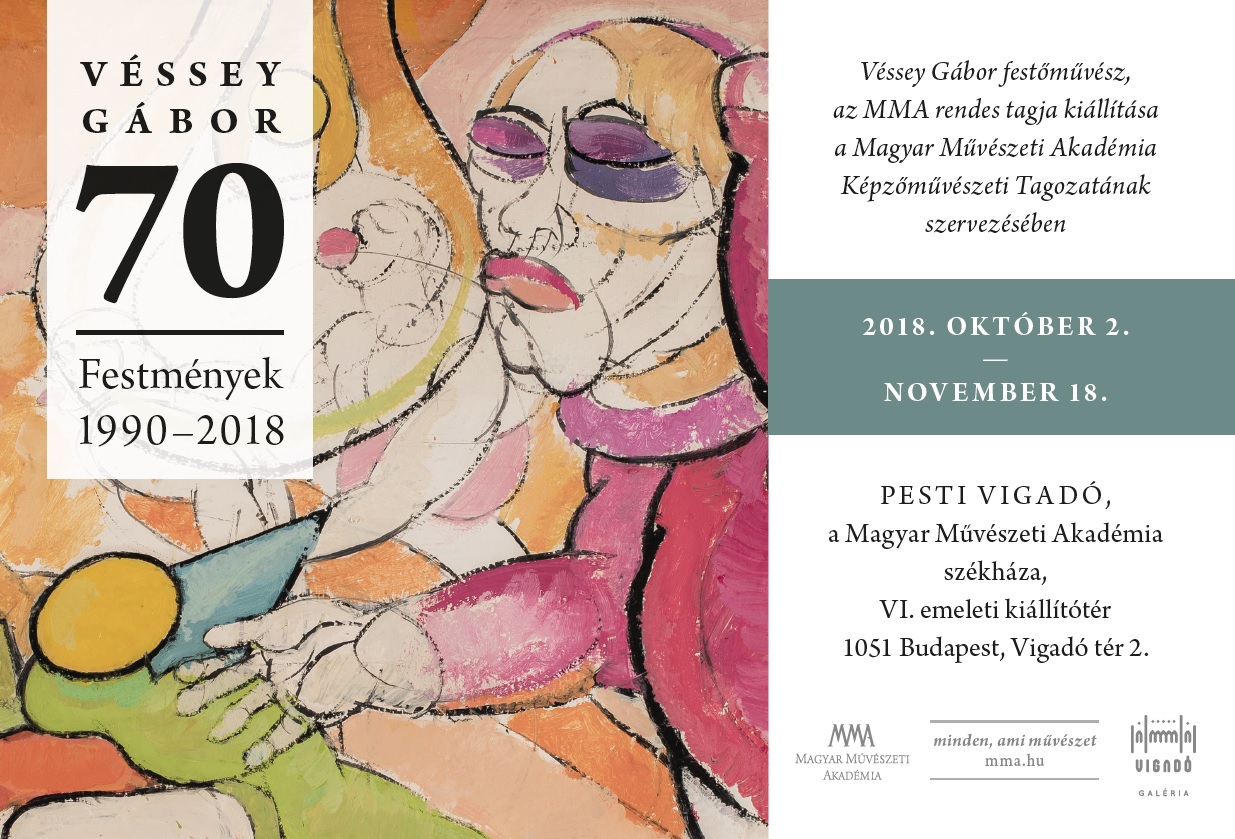 Véssey Gábor festőművész, a Magyar Művészeti Akadémia rendes tagjának képeiből és jó néhány szobrából nyílik kiállítás a Pesti Vigadó VI. emeleti termeiben, a művész 70. születésnapja alkalmából. A művész által gyakorolt képzőművészeti műfajok közül az olajtempera táblaképei, valamint az utóbbi években létrejött szobrai lesznek láthatók. A tárlat az utóbbi 30 év képeiből válogat. Figurális képei ironikus és expresszív hangvételükkel reflektálnak mindennapi világunkra. A legújabb festményei mellett láthatók lesznek együtt eddig még ki nem állított képsorozatai is, amelyekben Véssey Gábor a hozzá közel álló alkotók munkáira hommage-okban és parafrázisokban reflektál. A kiállítás alkalmából a MMA Kiadó összefoglaló albumot jelentet meg.