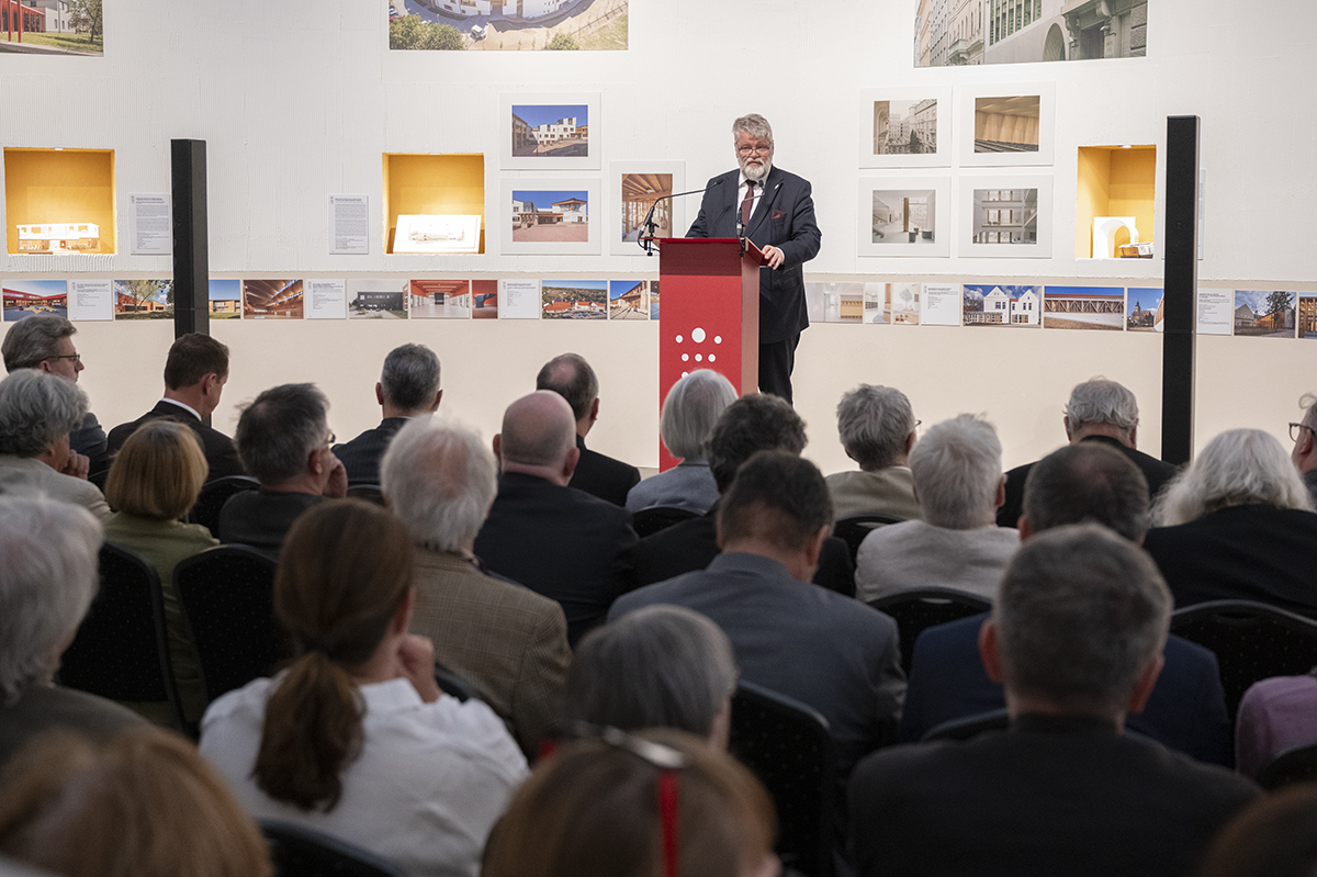 A tárlatot Dénes Eszter építész, építészeti szakíró, főkurátor, az MMA köztestületi tagja mutatta be a jelenlévőknek, kiemelve, hogy a kiállítás az eltérő nézőpontok minél teljesebb körű megvilágítására törekszik. Úgy fogalmazott, a teljességet nemcsak úgy lehet értelmezni, hogy minden ott van, hanem úgy is, hogy semmi sem hiányzik. A kiállítás főkurátora a társkurátorok (valamennyien Ybl-díjas építészek) által tervezett termeket is bemutatta. Ferencz Marcel DLA, az MMA rendes tagja az általa rendezett kiállítási térben azt a fő kérdést veti fel, hogy melyek az időtlen érték teremtésének lehetőségei a gyorsan változó jelenben. Az egyházi és állami nagyberuházások, az építészet közösségi-kulturális identitása, valamint az építészet szolgálatként való értelmezése is látható a tárlat ezen részében. A Gutowski Robert az MMA levelező tagja épített örökségünk helyzetét tárja fel válogatásában, mely szimbolikus történetekkel gazdagítja a bemutatást. Épülettöredékek kerülnek a középpontba kőből faragott épületeket megidézve, melyekben összefonódnak generációk történetei. Perényi Tamás DLA, társkurátorként az oktatási- és lakóépületeket vizsgálta, melyek a korszellem indikátorai, hosszútávra tervezett stratégia megvalósulásai.