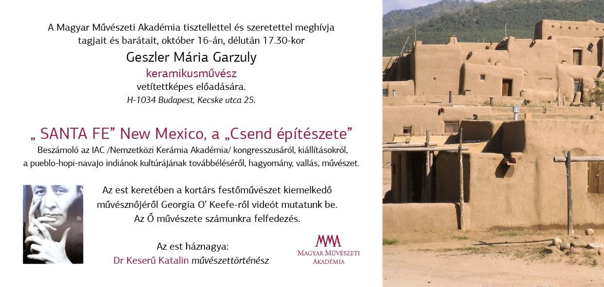 Vetítettképes előadást tartott a Kecske utcában Geszler Mária Garzuly keramikusművész, mely során az új-mexikói pueblo és hopi indiánok földjén tett látogatásáról számolt be. A háznagyi feladatokat ezúttal Keserü Katalin művészettörténész látta el.