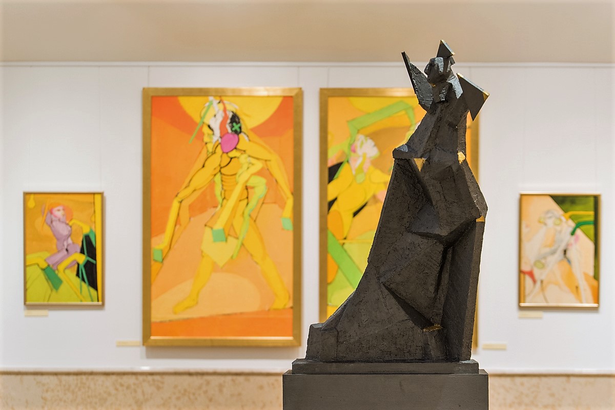 Jelen tárlat akár életmű-kiállításként is értékelhető, amely azonban csak részben szól a jubileumnak. Sokkal inkább az arra érdemes életműnek, annak az alkotó által is legfontosabbakként számon tartott darabjainak. Szól a közel fél századnak – a válogatott anyag időkerete ettől szűkebb; az arányaiban is tekintélyes életműből, az egyes pályaszakaszokból csupán szemezget a tárlat –, amely művek és műsorozatok, festett-rajzolt és plasztikai alkotások folyamát hozta el. Valahogy mindig a költészet és egyéb társművészetek közvetlen közelében, a vonal és a szín, különös helyzetek és látomások társaságában, miként ezt a Részeg Rembrandt (2012), Gilles-bohóc (2005) vagy az Orpheus személye köré fonódó művek mutatják.