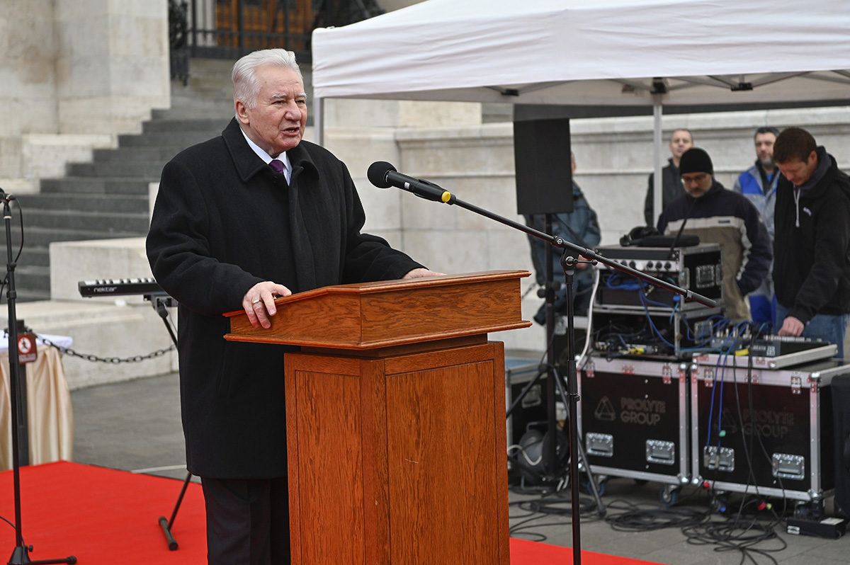 Az alkotást, amelyet vízkeresztig láthat a nagyközönség a Kossuth téren, Jakab István, a Magyar Országgyűlés alelnöke adta át. Ezután Tállai András, Kékedi László, Richly Gábor, valamint Jakab István megszólaltatták a betlehemhez tartozó harangot.