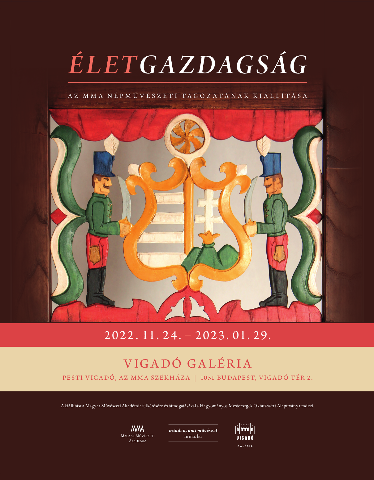 Életgazdagság címmel látható november 23-ától a Magyar Művészeti Akadémia Népművészeti Tagozatának kiállítása a Pesti Vigadóban. A címadó gondolat Andrásfalvy Bertalantól származik, és jól tükrözi a néphagyományban gyökerező alkotóerőt. A kiállítás – a Pesti Vigadó kiállítótereinek sajátosságait is figyelembe véve – hármas tagozódású: az Isten – haza – család hármas egység köré szerveződik. Ennek megfelelően három jól elkülönülő, de egymásból következő és egymáshoz kapcsolódó térben rendezték el a magyar hagyományban gyökerező alkotásokat.
