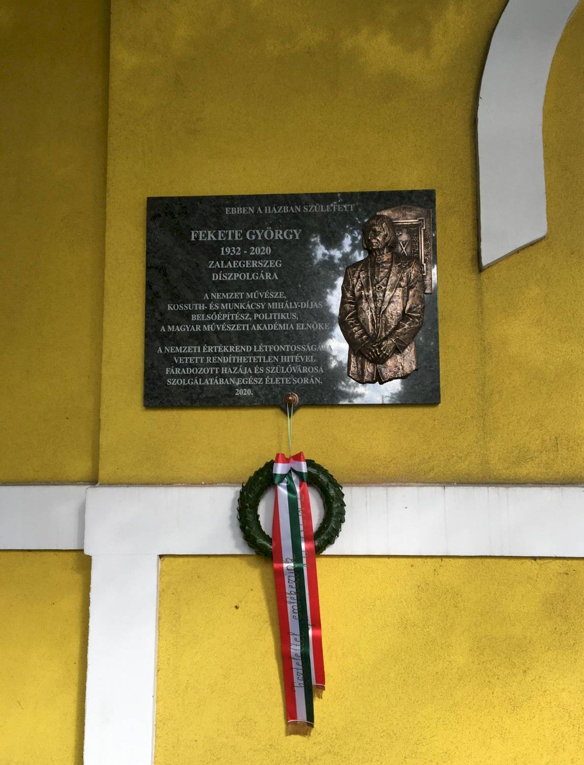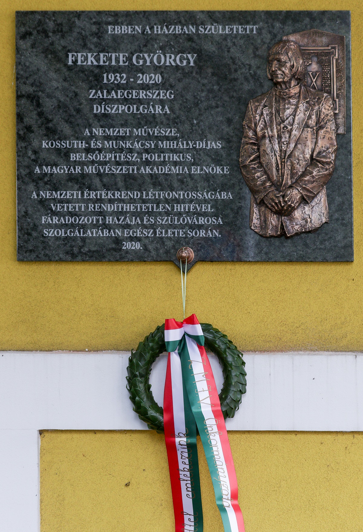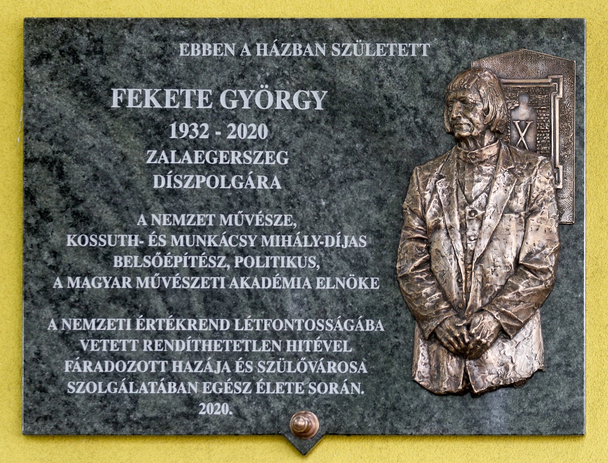 A Nemzet Művésze címmel is kitüntetett Fekete György Kossuth- és Munkácsy-díjas belsőépítész, kultúrpolitikus Zalaegerszeg Város és Zala megye díszpolgára is volt. Az emléktáblát szülőháza falán helyezték el. A dombormű derékmagasságtól ábrázolja alakját felöltőben, ahogy a legtöbbször láthattuk szereplései alkalmával. Az emléktábla felirata: „EBBEN A HÁZBAN SZÜLETETT FEKETE GYÖRGY 1932–2020 ZALAEGERSZEG DÍSZPOLGÁRA / A NEMZET MŰVÉSZE, KOSSUTH- ÉS MUNKÁCSY MIHÁLY-DÍJAS BELSŐÉPÍTÉSZ, POLITIKUS, A MAGYAR MŰVÉSZETI AKADÉMIA ELNÖKE / A NEMZETI ÉRTÉKREND LÉTFONTOSSÁGÁBA VETETT RENDÍTHETETLEN HITÉVEL FÁRADOZOTT HAZÁJA ÉS SZÜLŐVÁROSA SZOLGÁLATÁBAN EGÉSZ ÉLETE SORÁN."