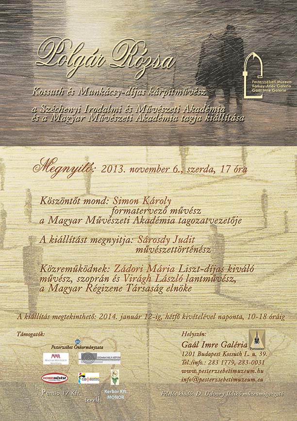 2013. november 6-án (szerdán) 17 órakor tartják Polgár Rózsa Kossuth- és Munkácsy-díjas kárpitművész, a Széchenyi Irodalmi és Művészeti Akadémia és a Magyar Művészeti Akadémia tagjának kiállításmegnyitóját. Köszöntőt mond: Simon Károly formatervező művész, a Magyar Művészeti Akadémia tagozatvezetője.