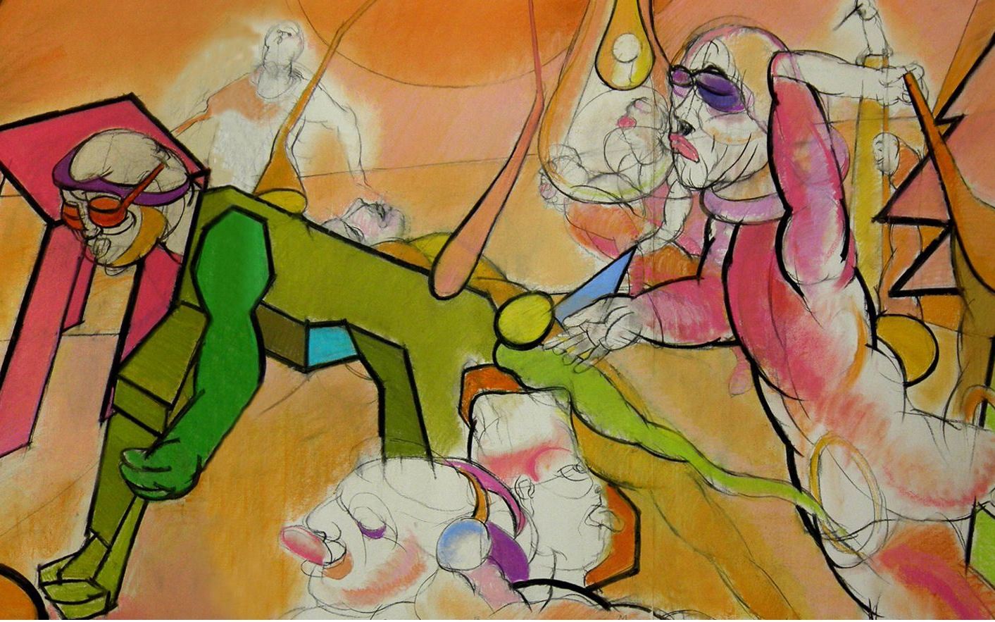 A galéria hátsó három termében 1980 és 1986 között készült 100 lapos sorozatából mutat be 18-20 lapot. Ezek 100 x 70 centiméteres képek és – elmondása szerint – hátteret adnak az első teremben látható fríznek.