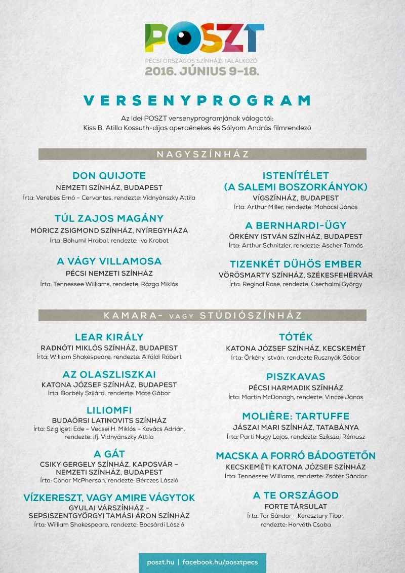 Az idei POSZT versenyprogramjának válogatói Kiss B. Attila operaénekes, a Magyar Művészeti Akadémia rendes tagja és Sólyom András filmrendező. A programban szerepel a budapesti Nemzeti Színház részéről a Vidnyánszky Attila rendezésében bemutatásra kerülő Don Quijote (Verebes Ernő – Cervantes) is.