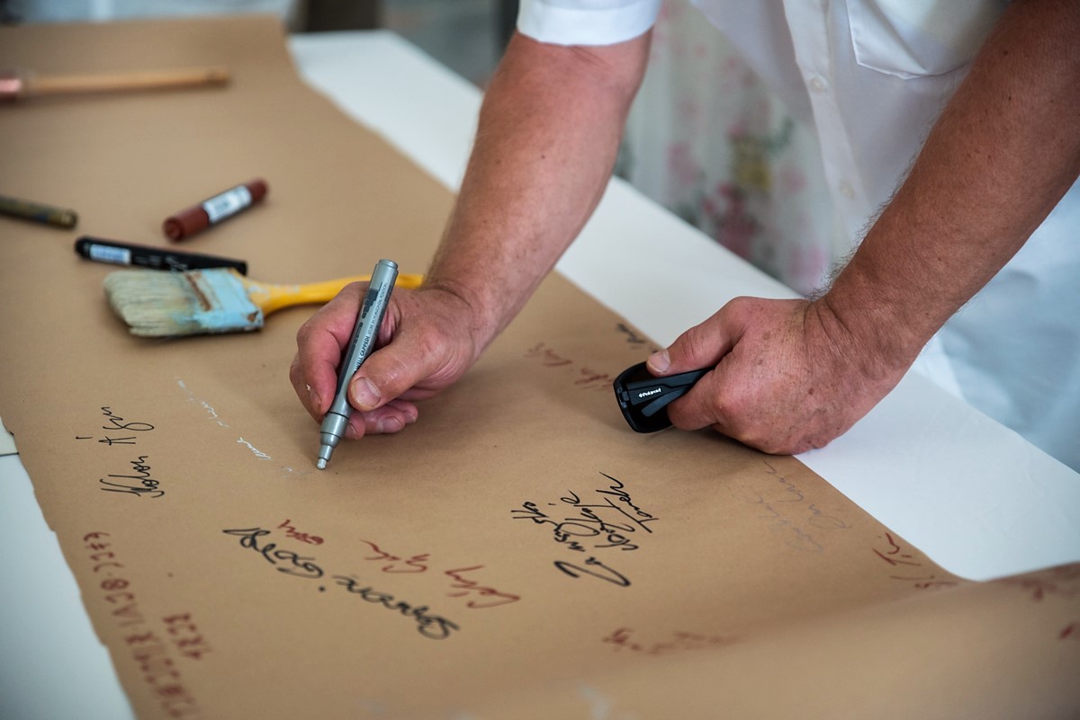 Árpád. Nem fociztunk soha, noha mindig szóba hoztuk, hogy kéne. Hogy kellett volna. Hogy játszik, kérdeztem Nagy Gáspártól, akivel még a Mozgó Világ-os időkben együtt focizott. Őszintén – vágta rá Gazsi, aki épp tíz éve már odafönt rúgja. Olyan őszintén. Ez jut eszembe, ha a képeit nézem, nem azért tesz oda egy színt, egy vonalat, egy formát, mert az ott jól néz ki, hanem azért, mert nem tehet mást. Becsület kérdése: azt kell odatennie.