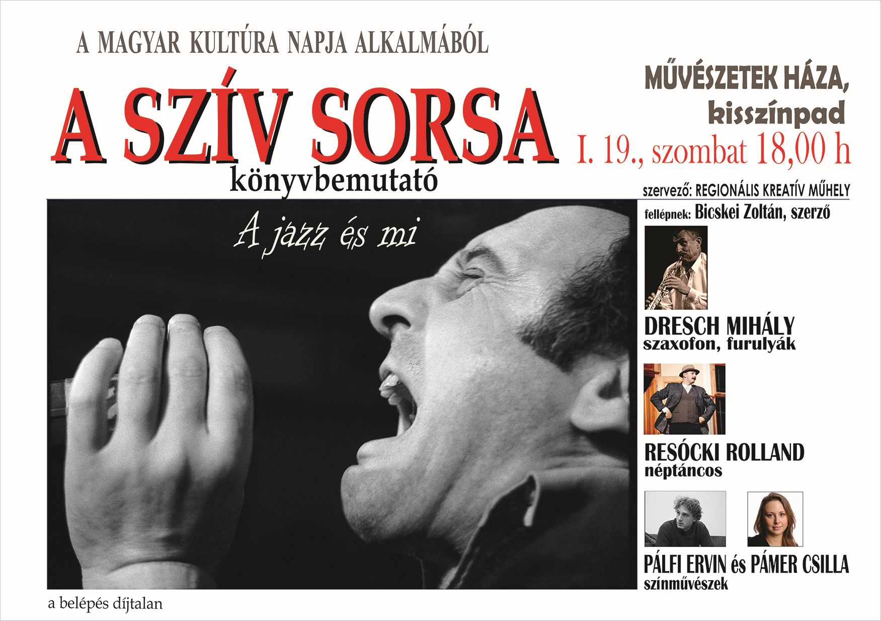 A magyarkanizsai Regionális Kreatív Műhely szervezésében január 19-én tartanak könyvbemutatót a magyar kultúra napja alkalmából. A Vajdasági Magyar Művelődési Intézet (Zenta) által kiadott, A szív sorsa c. könyv magyarkanizsai bemutatója szombaton, 18 órakor lesz a Művészetek Háza kisszínpadán. A könyv Bicskei Zoltán 1977 óta írt zeneesszéinek válogatását tartalmazza, alcíme A jazz és mi. A Dormán László 62 fotójával és a szerző rajzaival illusztrált könyvet jeles művészek mutatják be. Vendégek: a szerző, Bicskei Zoltán, Dresch Mihály zenész, Pálfi Ervin és Pámer Csilla színművészek, valamint Resócki Rolland néptáncos.