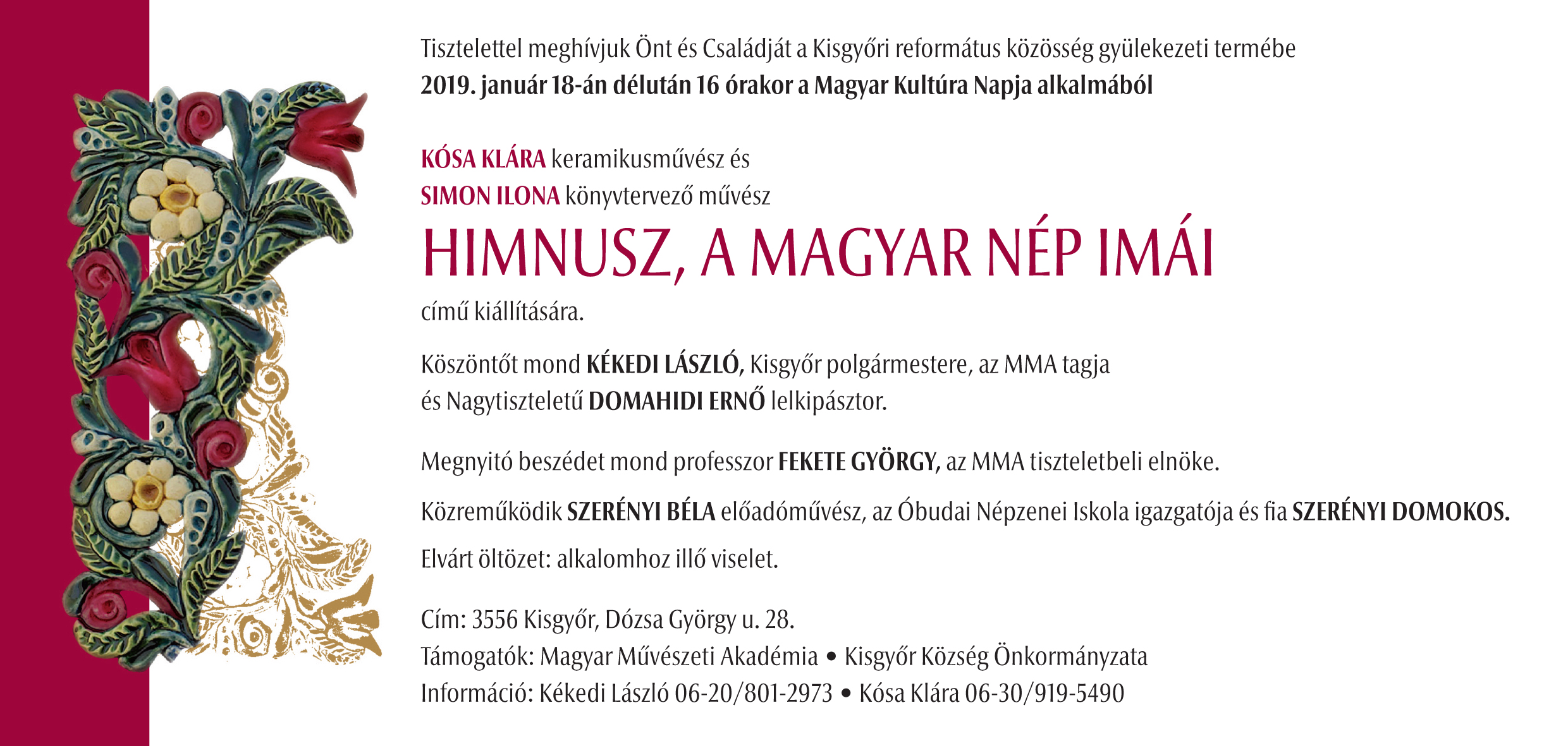 2019. január 18-án 16 órakor a magyar kultúra napja alkalmából Kósa Klára keramikusművész és Simon Ilona könyvtermvező művész Himnusz, a magyar nép imái című kiállítására várják az érdeklődőket a kisgyőri református közösség gyülekezeti termébe. A kiállítást prof. em. Fekete György, a Magyar Művészeti Akadémia tiszteletbeli elnöke nyitja meg. Köszöntőt mond Kékedi László, Kisgyőr polgármestere és Domahidi Ernő lelkipásztor. A rendezvényen Szerényi Béla előadóművész, az Óbudai Népzenei Iskola igazgatója és fia, Szerényi Domokos működik közre.
