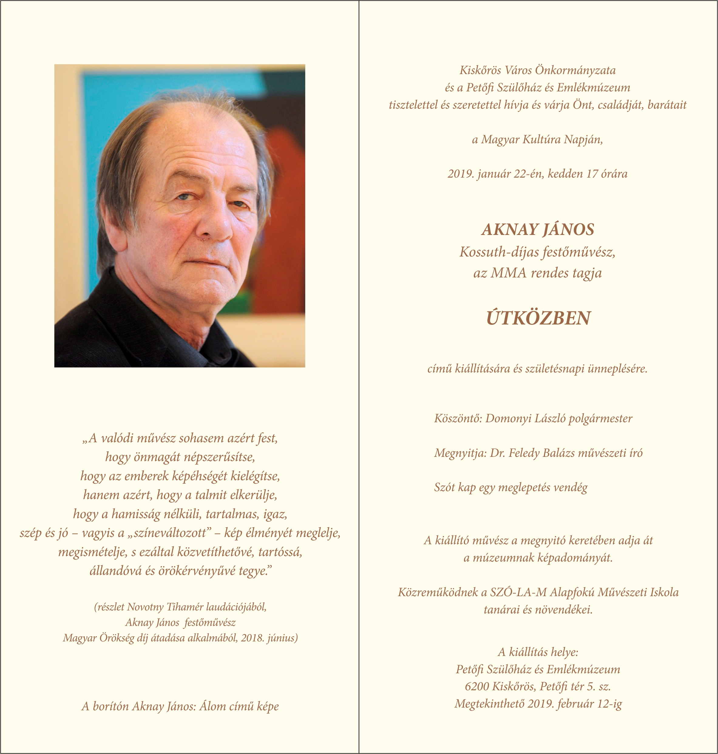 2019. január 22-én – a magyar kultúra napján – Kiskőrösön a Petőfi Szülőház és Emlékmúzeumban nyílik Aknay János festőművész, az MMA rendes tagjának Útközben című kiállítása. A tárlatot 17 órakor Feledy Balázs művészeti író nyitja meg, a kiállító művész a megnyitó keretében adja át a múzeumnak képadományát.