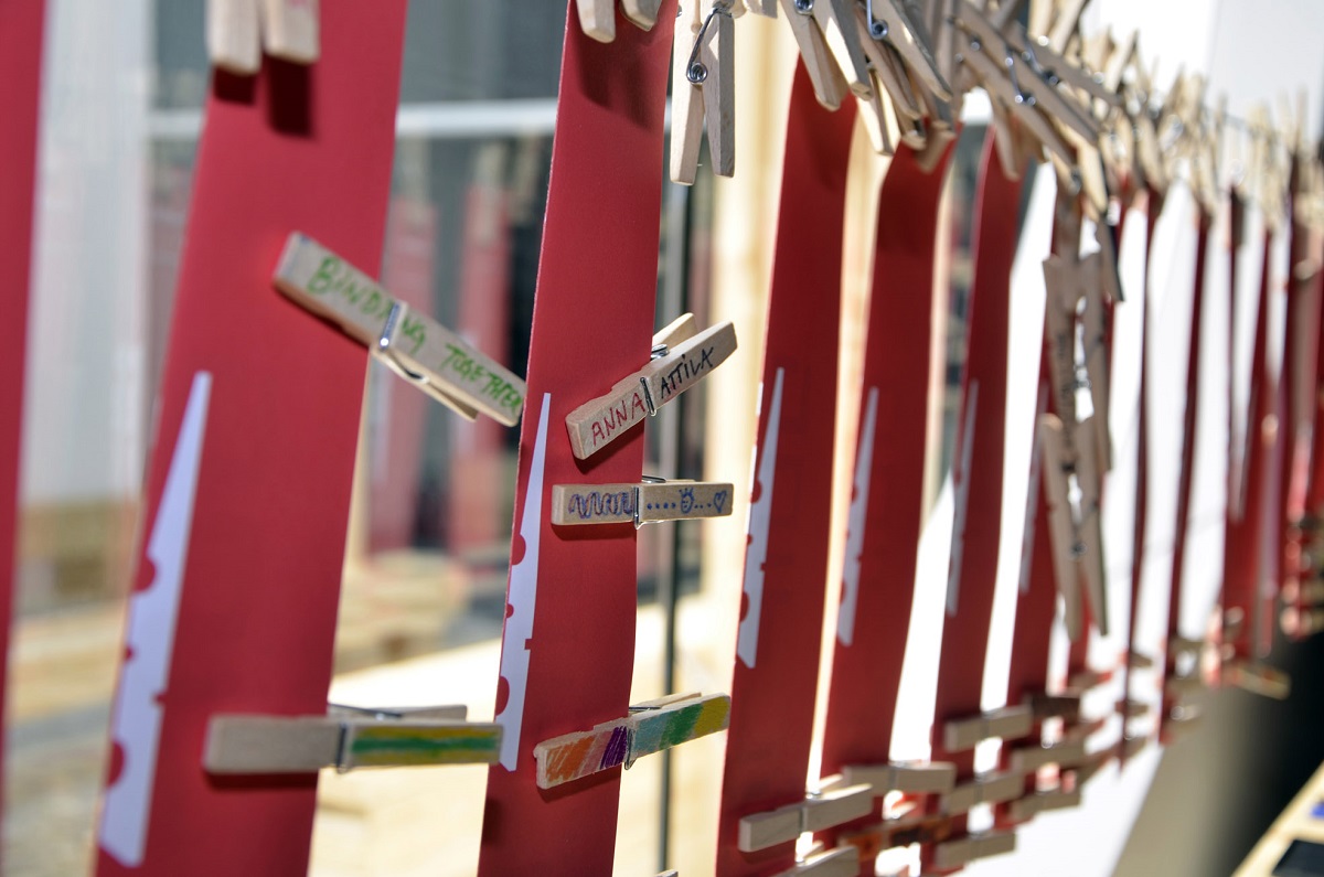 A kurátorok egyúttal interaktív játékra invitálják az ide látogatókat: az építésbe egy-egy csipesz kihelyezésével, vagy arra üzenet írásával lehet bekapcsolódni. Ezzel egy formálódó tér alkotó részesévé válhatunk.