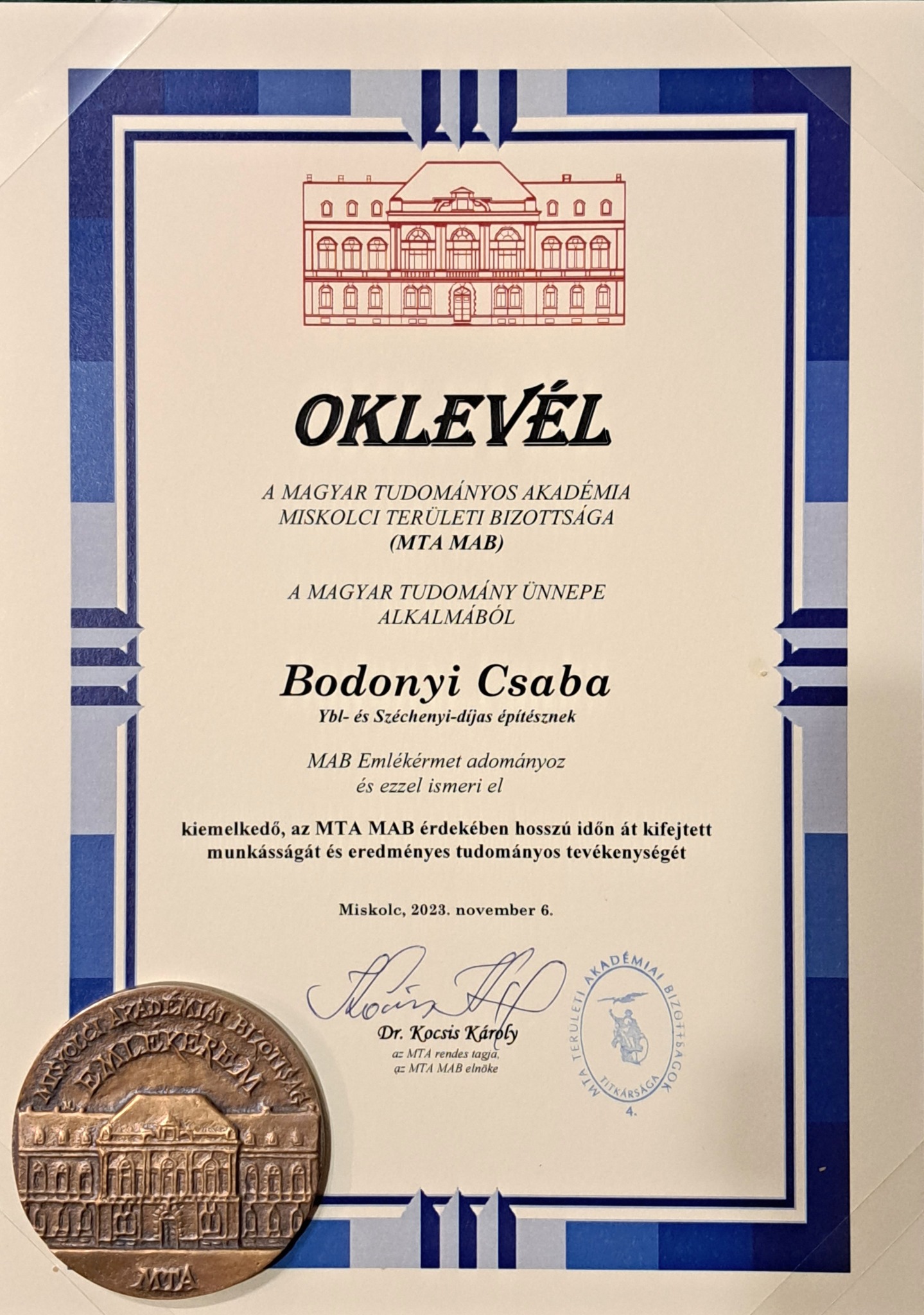 November 6-án a MTA-MAB Tudomány hónapjának megnyitó ünnepségén Bodonyi Csaba DLA Széchenyi- és Ybl-díjas építész, az MMA Miskolci Regionális Munkacsoportjának elnöke kitüntetést kapott.