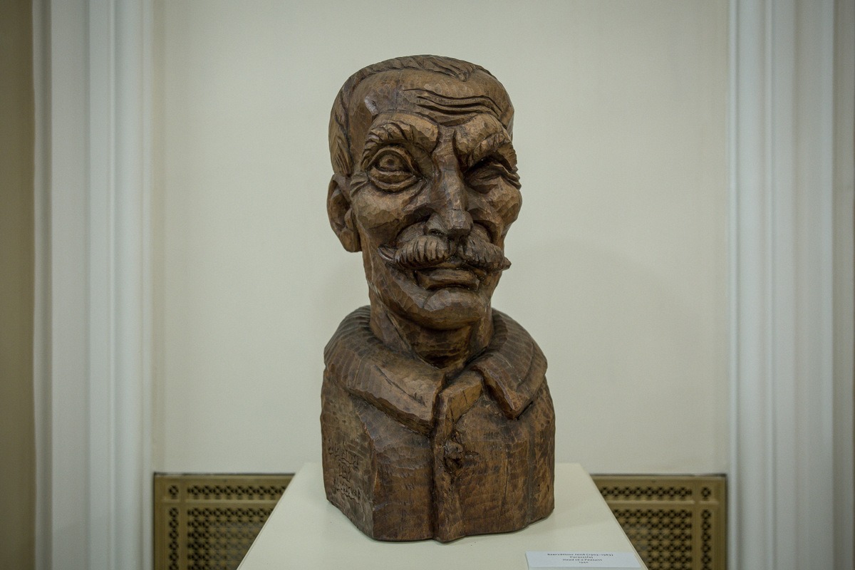 A kiállítótér egyik belépőjénél Keöpeczi Sebestyén József festett munkája, A székelyek címerei köszön ránk, s közelében rögtön egy székelyföldi Parasztfej (1940), Szervátiusz Jenő alkotása. Fából készült, de a tekintet, a kiállás a kő szilárdságához hasonlatos. A földnek s az életnek egyaránt elkötelezett kemény, szikár arc tekint ránk; mentes örömtől s bánattól, noha sűrűn barázdált. Az egyik szemöldök alatt a szemhéj mélyen leesik, mintha csak az volna legnagyobb gondja, hogy a Nap fénye ellen védekezzen.