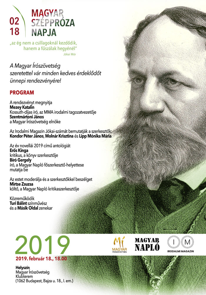 A Magyar Írószövetség ünnepi rendezvényén a szerkesztők, Kondor Péter János, Molnár Krisztina és Lipp Mónika Mária ismertetik az Irodalmi Magazin Jókai Mór előtt tisztelgő számát, majd Az év novellái 2019 című antológiát mutatja be Erős Kinga kritikus, a könyv szerkesztője és Bíró Gergely író, a Magyar Napló főszerkesztő-helyettese.