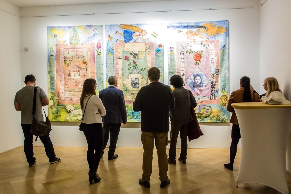 Varga Sinai Gizella képzőművész Útleírás című tárlata festett és írásokkal ellátott vásznakon, ruhákon, szőnyegeken meséli el a művész élettörténetét a Várkert Bazárban. A kiállítás megnyitóján részt vett és beszédet mondott Jankovics Marcell, a Magyar Művészeti Akadémia alelnöke.